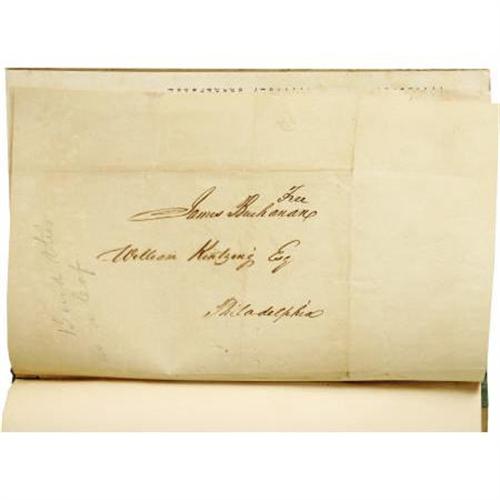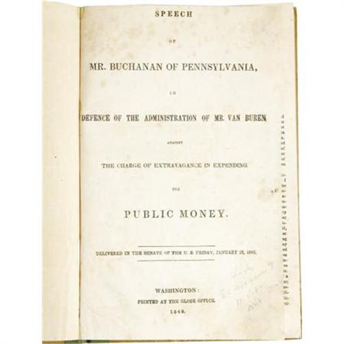 <B>James Buchanan Franked Address Leaf </B></I>bound in an 1841 pro-Van Buren Speech.<B> </B></I><I>Speech/of/Mr. Buchanan of Pennsylvania,/in/Defence of the Administration of Mr. Van Buren/against/The Charge of Extravagance in Expending/the/Public Money,</B></I> 14 pages, 5.5” x 8.5”. Board covers, green spine. The address leaf is franked “<I>Free/James Buchanan</B></I>” and is addressed by him to “<I>William Kintzing Esq/Philadelphia.</B></I>” It is inserted in front of the title page. Buchanan's speech was delivered in the U.S. Senate on January 22, 1841. The pages are lightly foxed. In 1840, Whig William Henry Harrison had been elected President, defeating the incumbent, Democrat Martin Van Buren, and would take office six weeks later. In part, “<I>Mr. Buchanan rose to answer each of the four specific charges of extravagance which had been made by the Senator from Kentucky </B></I> Mr. Crittenden <I>against the present Administration. The Senator had called upon him personally to make this answer; and he undertook the talk with pleasure, not believing it to be one of much difficulty…And in the first place, said Mr. B, permit me to observe, that I, at least, have never introduced into this Senate, as topics of debate, 'log cabins, hard cider, and coon skins;' nor have I ever made an observation here which could be tortured into a reflection upon either the integrity or intelligence of the people of the United States for having elected General Harrison their President…</B></I>” In the 1840 presidential campaign, Democrats had referred to Harrison as an old man sitting in his cabin, wearing a coon skin cap, drinking hard cider. Fine condition. <I>Ex. Henry E. Luhrs Collection.</B></I><BR><BR><BR><b>Shipping:</b> Flat Material, Small (<a target="_blank" href="http://www.heritageauctions.com/common/shipping.php">view shipping information</a>)