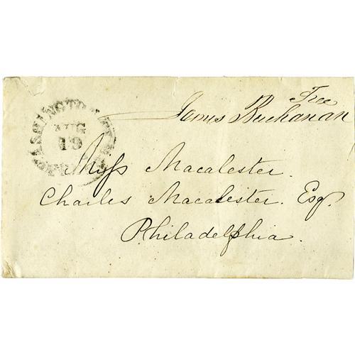 <B> James Buchanan Free Franked Envelope Signed </B></I> "<I>James Buchanan.</B></I>" 5" x 2.8", signed in the upper right corner by Buchanan. Only the cancellation stamp is present; the envelope is addressed to Charles Macalester Esq., in Philadelphia. <BR><BR> The free frank is in fine condition; some yellowing and soiling present on the envelope; the back of the envelope is badly torn; the signature is bold and clear.