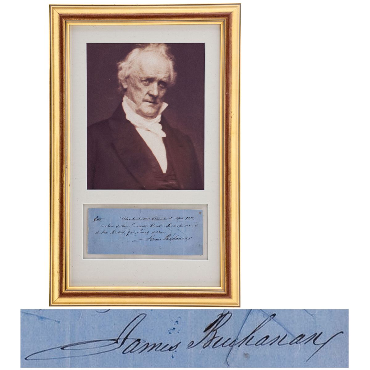 James Buchanan manuscript check signed, written entirely in his hand and dated 5 April 1852. Written the same year Buchanan sought the Democratic presidential nomination for the third time. Check is drawn on the Lancaster Bank for $20.00 payable to Jacob S. Yost, a congressman from Pennsylvania who was later appointed U.S. Marshall for the Eastern District of Pennsylvania by President Buchanan. Two cut cancellations slightly affecting the signature. Check measures 7.75'' x 3'' and is matted and framed with a photograph to an overall size of 13'' x 20.5''. Very good condition.