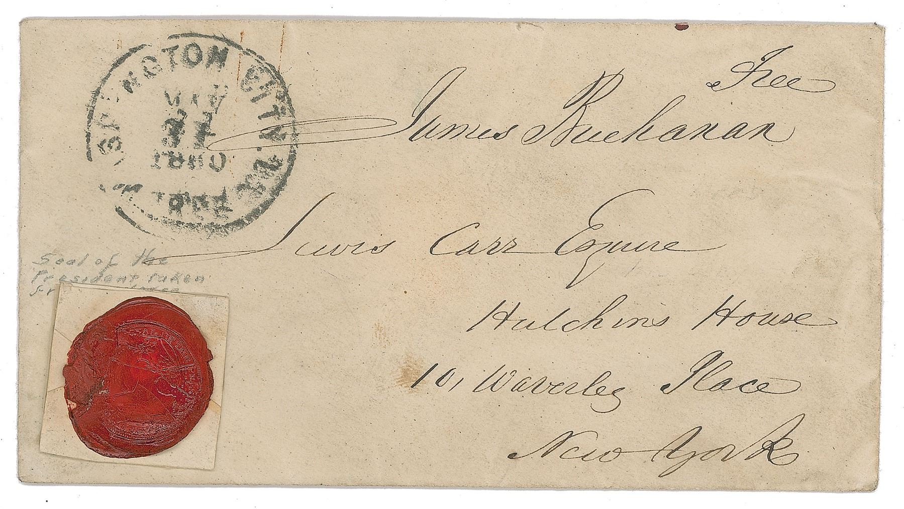 Hand-addressed and free franked mailing envelope as president, 5.25 x 3.75, addressed by Buchanan to "Lewis Carr Esquire, Hutchins House, 10 Waverley Place, New York," and franked in the upper right, "Free, James Buchanan." Postmarked at Washington, May 31, 1860. The red wax seal has been clipped from the back and was once affixed to the lower left corner, but the adhesive has dried out. In fine condition.