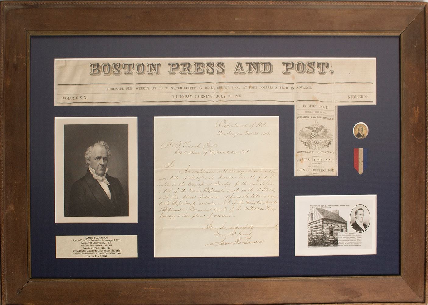 Framed letter with ephemera of James Buchanan, 50th President of the Untied States, elected 1857. Approximately 18 x 24" frame of a full page signed letter to B. B. French, Clerk, House of Reps, November 21, 1846. Also includes original Boston newspaper advertisement for Buchanan and Breckinridge, 1856 and a political button. At the time the letter was written, Buchanan was secretary of State under President Polk. Buchanan's decision to not be involved with the secessionist issues cause him today to be rated the worst president in US History. Date: Location: HWAC # 55964