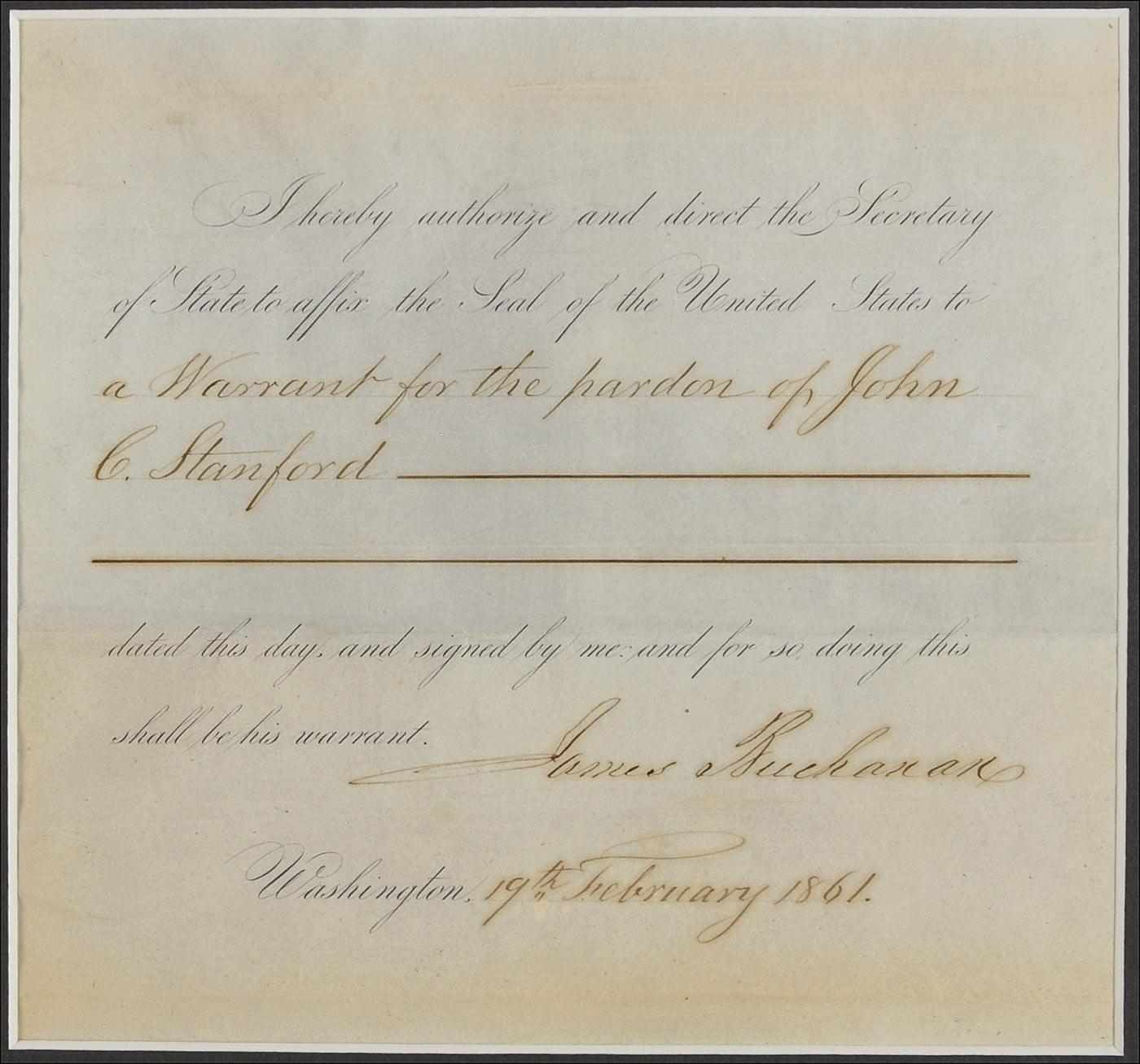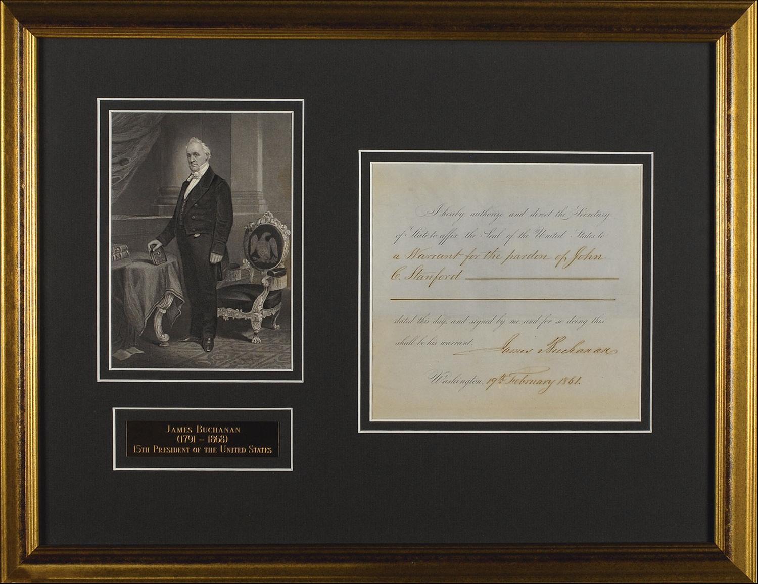 Partly-printed DS as president, one page, 7.5 x 7.25, February 19, 1861. Buchanan orders the Secretary of State to affix the seal of the United States to “a Warrant for the pardon of John C. Stanford.” Archivally double matted and framed with a portrait of Buchanan and a name plaque to an overall size of 21.5 x 16.5. In very good condition, with several horizontal folds and creases, scattered toning, including over signature, and some light spreading of ink to signature.