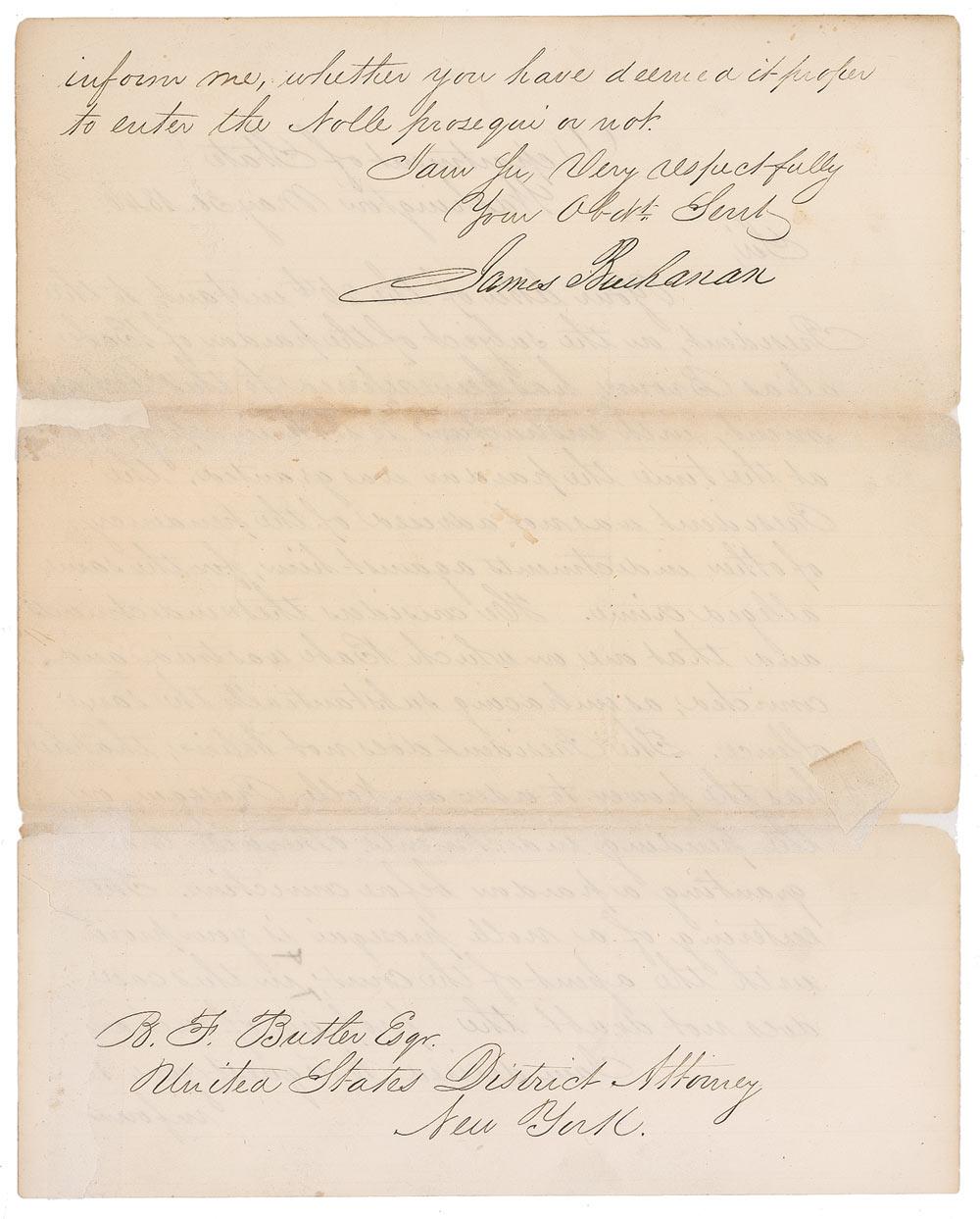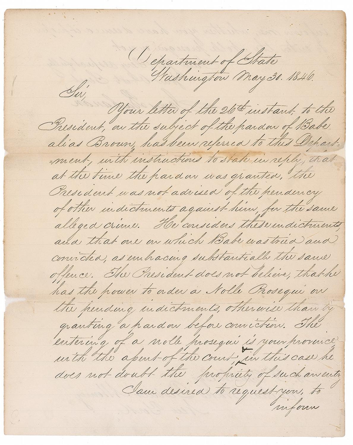 LS as secretary of state, one page both sides, 8 x 10, May 30, 1846. Letter to Benjamin F. Butler, the US District Attorney of New York. In full: “Your letter of the 26th instant, to the President, on the subject of the pardon of Babe alias Brown, has been referred to this Department, with instructions to state in reply, that at the time the pardon was granted, the President was not advised of the pendency of other indictments against him, for the same alleged crime. He considers these indictments, and that one on which Babe was tried and convicted, as embracing substantially the same offence. The President does not believe, that he has the power to order a Nolle Prosequi on the pending indictments, otherwise than by granting a pardon before conviction. The entering of a nolle prosequi is your province with the assent of the court; in this case he does not doubt the propriety of such an entry. I am desired to request you, to inform me, whether you have deemed it proper to enter the nolle prosequi or not.” Some professional restoration to paper loss at edges, tape repairs and reinforcement to both horizontal folds, scattered light toning, and a few creases and wrinkles, otherwise very good condition.