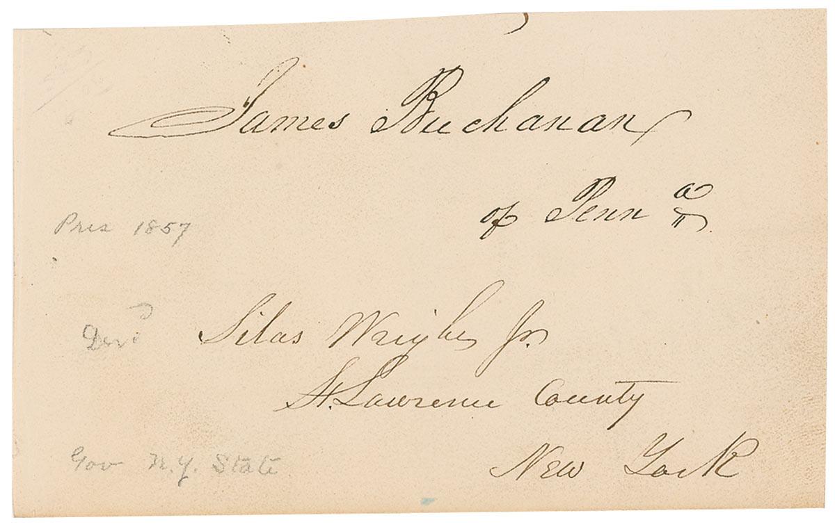 Ink signature, “James Buchanan, Penn,” on an off-white 5 x 3 trimmed album page. In fine condition, with a couple small pencil notations and some light edge toning and soiling.