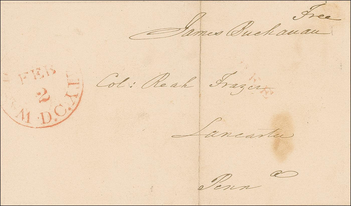 Free franked address panel, 5 x 2.75, addressed in Buchanan’s hand to “Col: Reah Frazer, Lancaster, Penn,” and franked in the upper right, “Free James Buchanan.” Panel bears a February 2, Washington City postmark. Panel has been inlaid to an 8 x 5.5 off-white sheet. A vertical fold through portion of address and a single letter of signature, and some scattered light toning, otherwise fine condition.