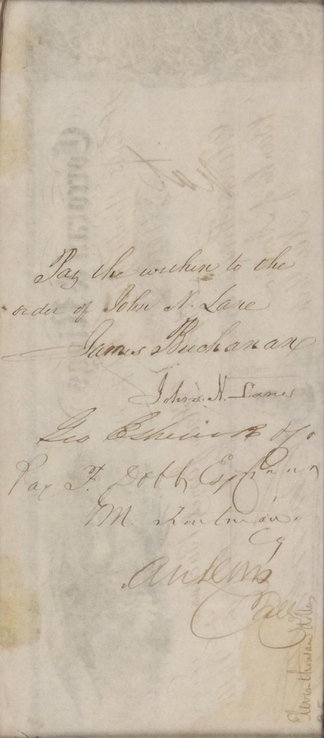 Corcoran & Riggs bank check, 8 x 3.25, filled out and signed in another hand, payable to Hon. James Buchanan for $11,000.00, February 7, 1850. Endorsed on the reverse, “Pay the within to the order of John N. Lane, James Buchanan.” Reverse also bears several other endorsements. Matted and framed, so both sides may be read, to an overall size of 12 x 7.5. In very good condition, with cancellation cut to body, with a couple of the cuts passing through portions of Buchanan’s endorsement, scattered toning, and light show-through from writing on opposite sides. John Lane was an uncle to Buchanan’s niece, Harriet Lane.