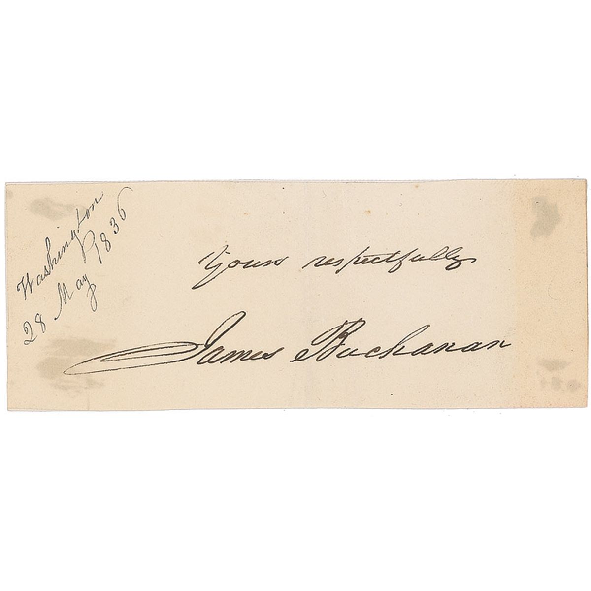 Ink signature, “Yours respectfully, James Buchanan,” on an off-white 4.5 x 1.75 slip clipped from a letter, affixed to a slip of the same size, with an ink notation in another hand, “Washington, 28 May 1836.” In very good condition, with two vertical folds, a uniform shade of toning with a heavier strip along the right edge, and show-through from mounting adhesive at each of the corners, one of which lightly affects the first letter of the signature. Accompanied by a signature of Abraham Lincoln’s vice president, Hannibal Hamlin.