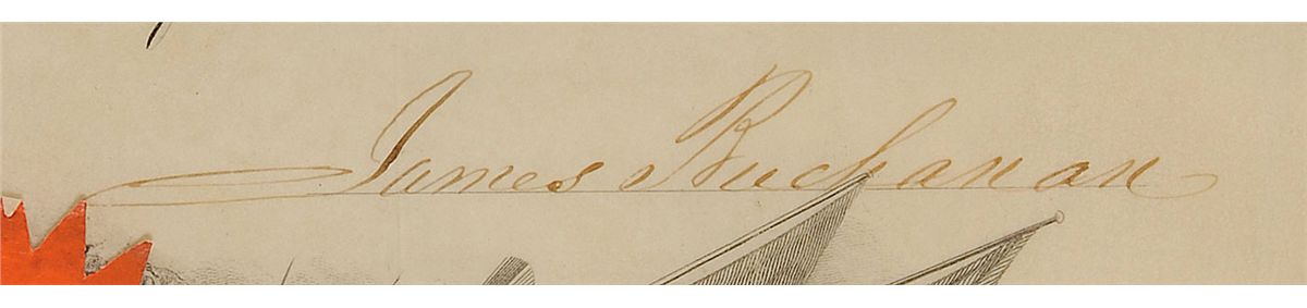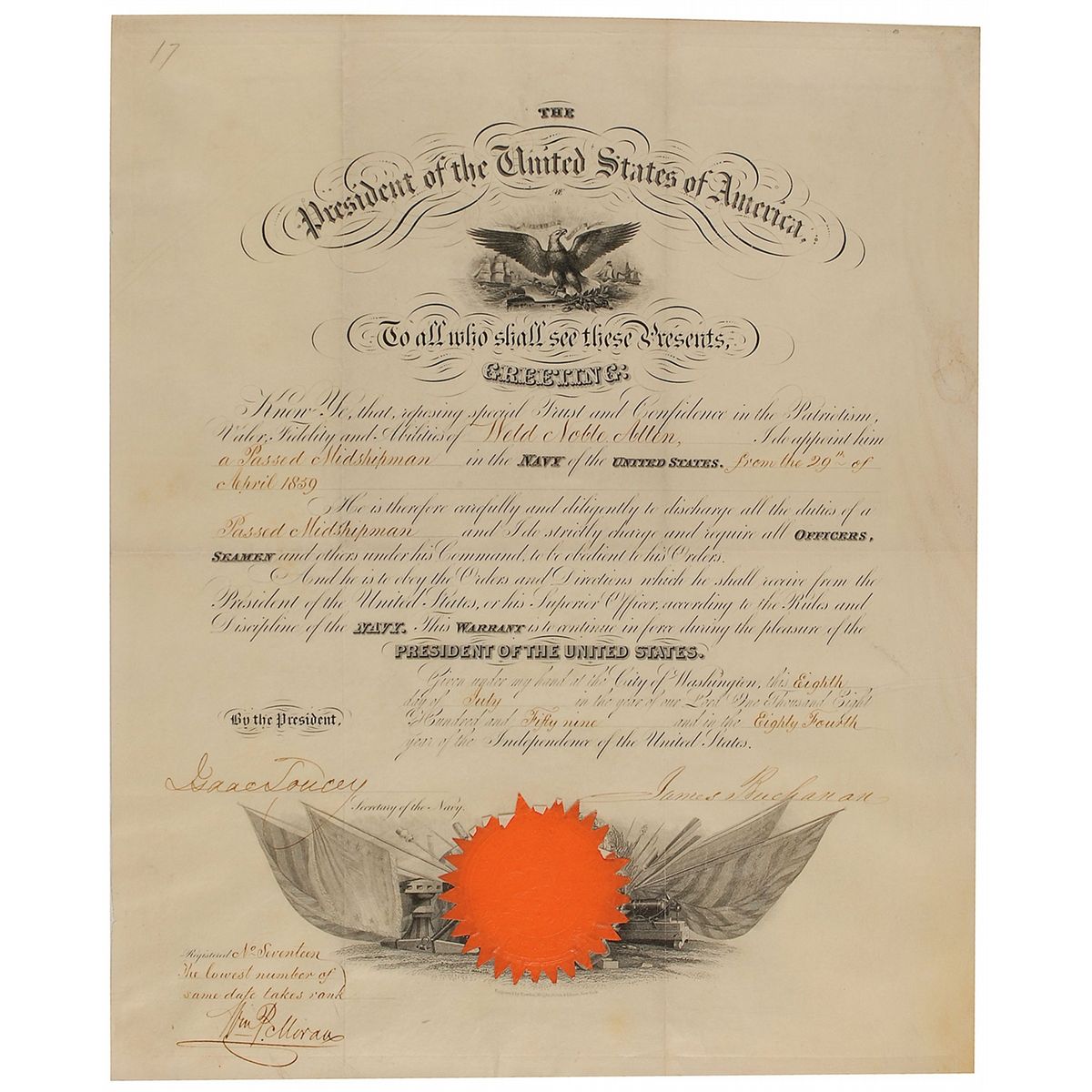 Partly-printed DS as president, one page, 13.75 x 16.75, July 8, 1859. President Buchanan appoints Weld Noble Allen “a Passed Midshipman in the Navy of the United States.” Signed at the conclusion by Buchanan and countersigned by Secretary of the Navy Isaac Toucey. Intersecting folds, one through a single letter of signature, small repaired hole to right edge, a bit of mild toning, and some light edge curling, otherwise fine condition. The orange seal is worn, but intact. Allen (1837-1875) graduated from the US Naval Academy in 1855 and commanded a navy gunboat in the Civil War as part of the Western Gulf Blockading Squadron.