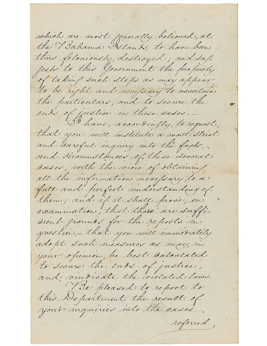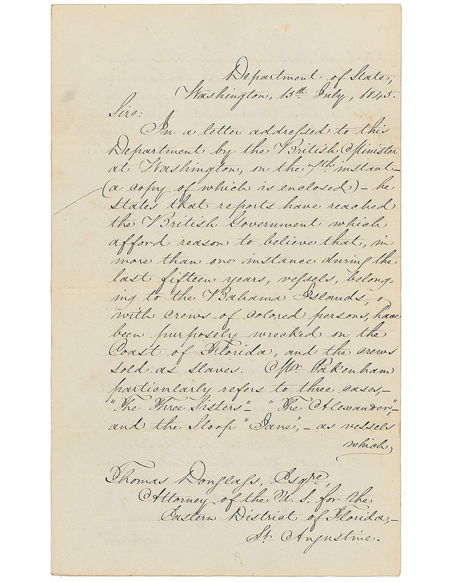 LS, three pages, lightly-lined on two adjoining sheets, 8.25 x 13.5, July 15, 1845. Letter written to Thomas Douglas, Attorney of the US for the Eastern District of Florida. In full: “In a letter addressed to this Department by the British Minister at Washington on the 7th inst. (a copy of which is enclosed) he states that reports have reached the British Government which afforded reason to believe that, in more than one instance during the last fifteen years vessels belonging to the Bahama Islands, with crews of colored persons, have been purposely wrecked on the coast of Florida, and the crews sold as slaves. Mr. Pakenham particularly refers to three cases—‘The Three Sisters,’ ‘The Alexander,’ and the Sloop ‘Jane’—as vessels which are most generally believed, at the Bahama Islands, to have been feloniously destroyed, and suggests to this Government the propriety of taking such steps as may appear to be right and necessary to ascertain the particulars, and secure the ends of justice in these cases.