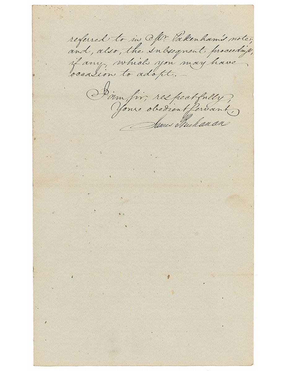 Although the United States and Great Britain had been cooperating in patrols to suppress the international slave trade, which had been legally abolished by both in the early 1800s, several related incidents continued to cause tension between the two nations. Beginning in 1818, when the British ruled that any slave brought to the Bahamas from outside the British West Indies would be manumitted, countless American ships were forced to dock there—both by the Royal Navy and by revolting slaves on board—and free any slaves who were on board. (By 1842, the US had lost nearly 450 slaves in this manner.) Increasingly dependent on slave labor, this caused significant concern in the States. In response, Americans were said to be intentionally wrecking ships off the coast of Florida and forcing any black crew members into slavery once on land—the precise issue at hand in this letter from recently appointed Secretary of State James Buchanan. An interesting letter dealing with one of the most contentious issues in history.