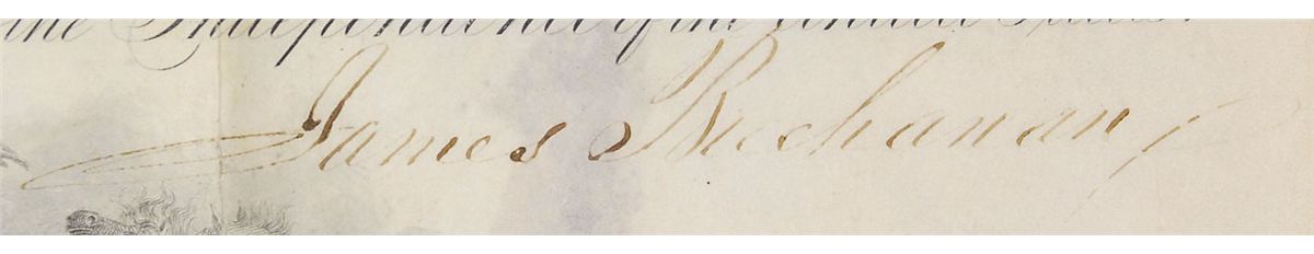 Partly-printed vellum DS as president, one page, 15 x 18, November 20, 1858. President Buchanan appoints James Fulton as “a purser in the Navy.” Signed at the conclusion by Buchanan and countersigned by Secretary of the Navy Isaac Toucey. Seal affixed at the bottom remains fully intact with rubbing to surface. Intersecting storage folds and light toning to borders from previous display, otherwise fine condition.