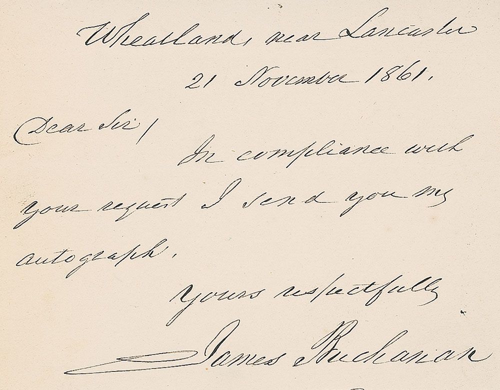 War-dated ALS, one page, 4.25 x 3.25, November 21, 1861. Neatly penned response to an autograph request. In full: “In compliance with your request I send you my autograph.” In fine condition. Accompanied by an unsigned engraved portrait of Buchanan.