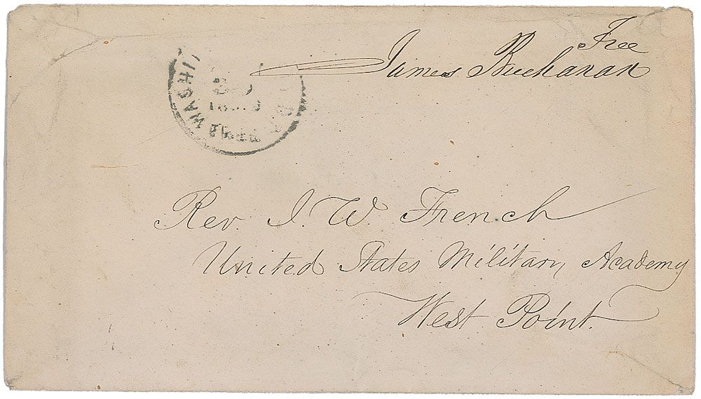 Free-franked mailing envelope, 6.75 x 3.75, addressed in another hand to “Rev. J. W. French, United States Military Academy, West Point,” and franked in the upper right, as president, “Free, James Buchanan.” Envelope bears a partial Washington DC postmark, and also retains its red wax presidential seal on the reverse. A few light creases, as well as some scattered light toning and soiling, otherwise fine condition.