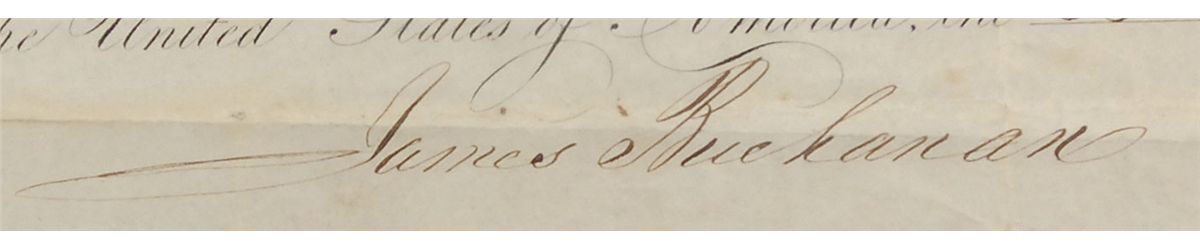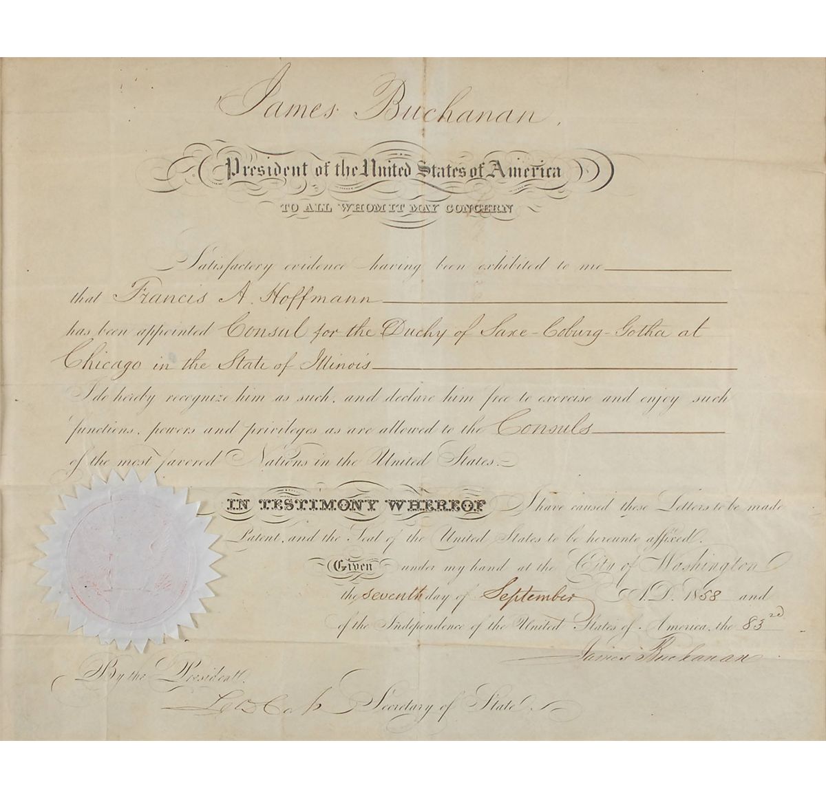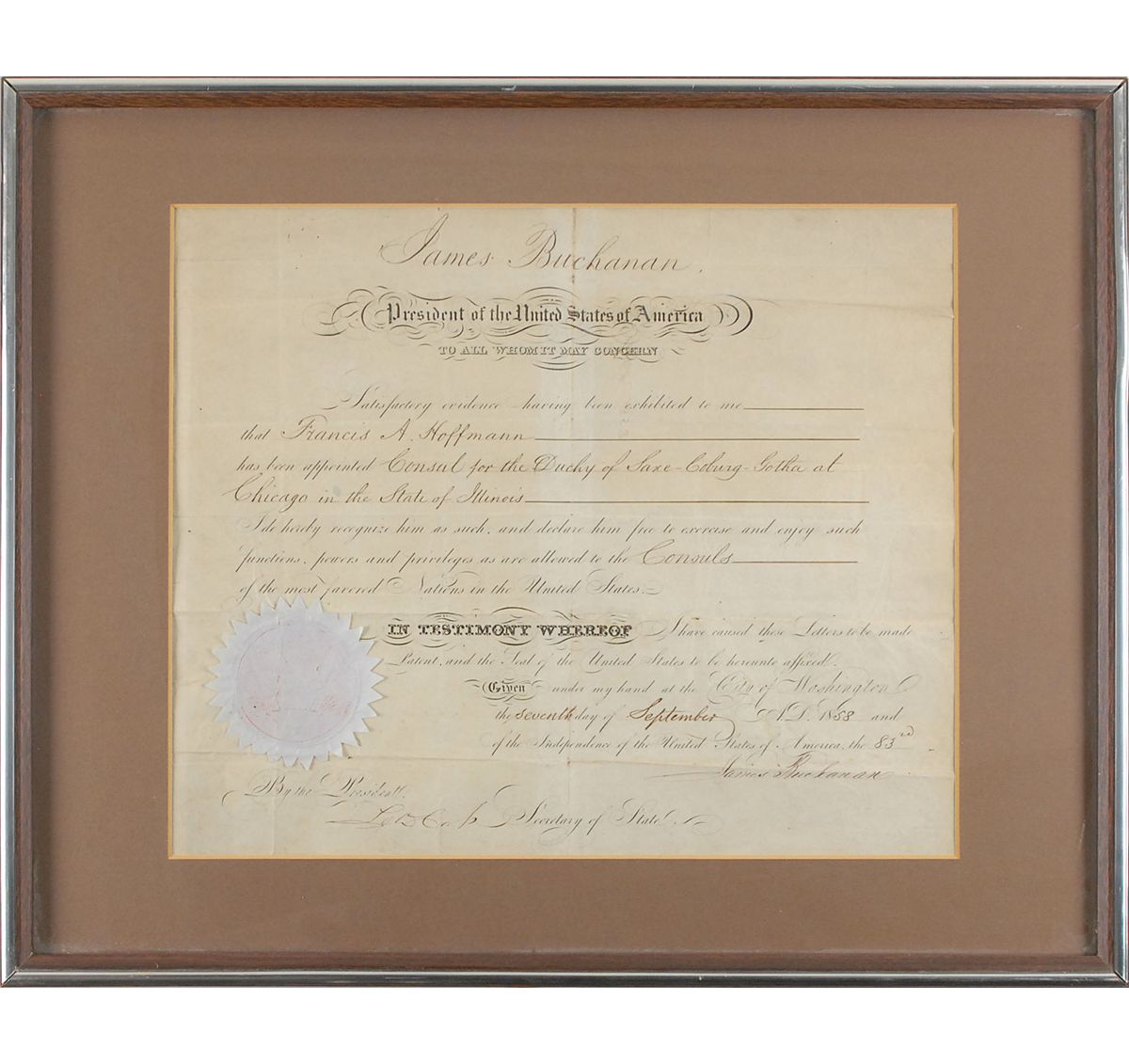 Partly-printed DS as president, one page, 14.5 x 12, September 7, 1858. President Buchanan officially recognizes Francis A. Hoffmann as “Consul for the Duchy of Saxe-Coburg-Gotha at Chicago in the State of Illinois.” Signed at the conclusion by Buchanan and countersigned by Secretary of State Lewis Cass. Matted and framed to an overall size of 21 x 17. Numerous intersecting folds (one horizontal fold passing through the signature), otherwise fine condition. Born in Westphalia, Prussia, Hoffmann emigrated to the US in 1840 to avoid conscription, eventually studying law in Chicago where he became involved in politics. He was known as a vigorous opponent of the extension of slavery and he helped found the Republican Party in Illinois.