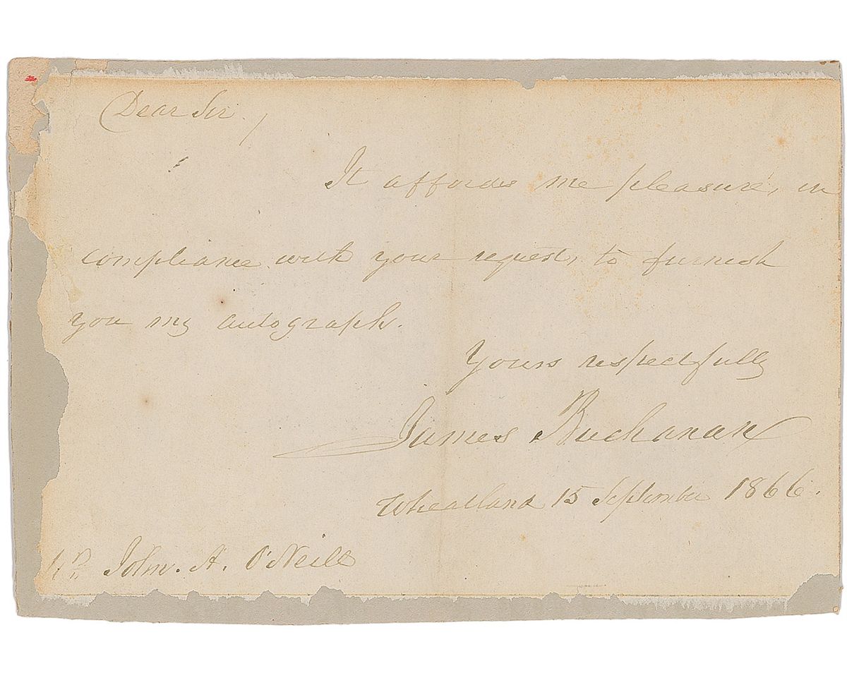 ALS, one page, 5.75 x 3.75, September 15, 1866. Brief letter complying with an autograph request. In full: “It affords me great pleasure in compliance with your request to furnish you my autograph.” Letter is affixed to a slightly larger board. In very good condition, with a central vertical fold, paper loss and light toning to edges, and writing and signature a few shades light, but still completely legible.