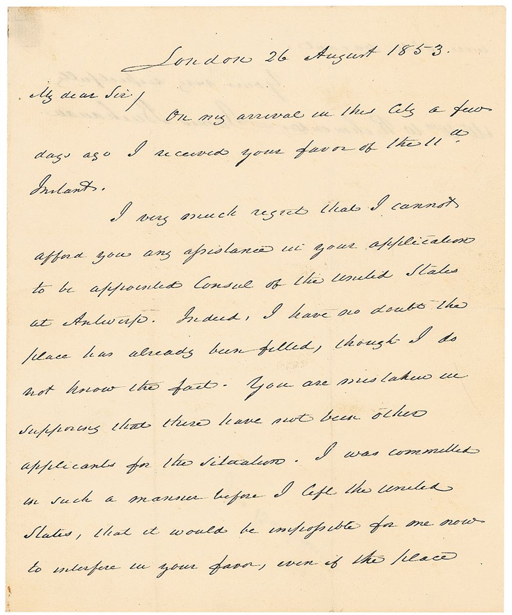 ALS, one page both sides, 7.25 x 9, August 26, 1853. Letter, written as Ambassador to England, to W. William Richmond. In full: “On my arrival in the city a few days ago I received your favor of the 11th Instant. I very much regret that I cannot afford you any assistance in your application to be appointed Consul of the United States at Antwerp. Indeed, I have no doubt the place has already been filled, though I do not know the fact. You are mistaken in supposing that there have not been other applicants for the situation. I was committed in such a manner before I left the United States, that it would be improbable for me now to interfere in your favor, even if the place were still vacant.” The letter has been removably archivally sleeved in acid free Mylar. In fine condition, with intersecting folds. Accompanied by two unsigned engravings.