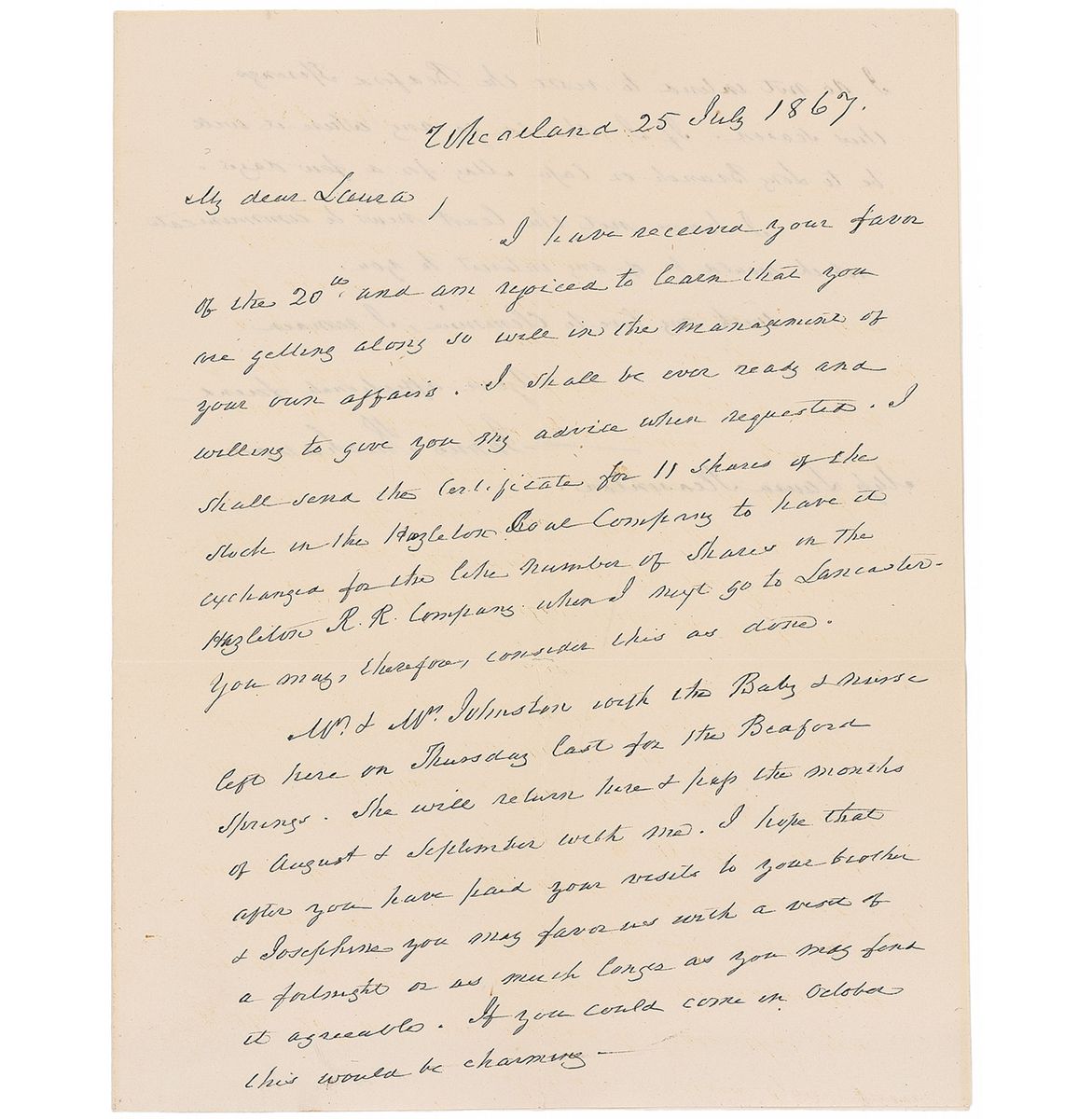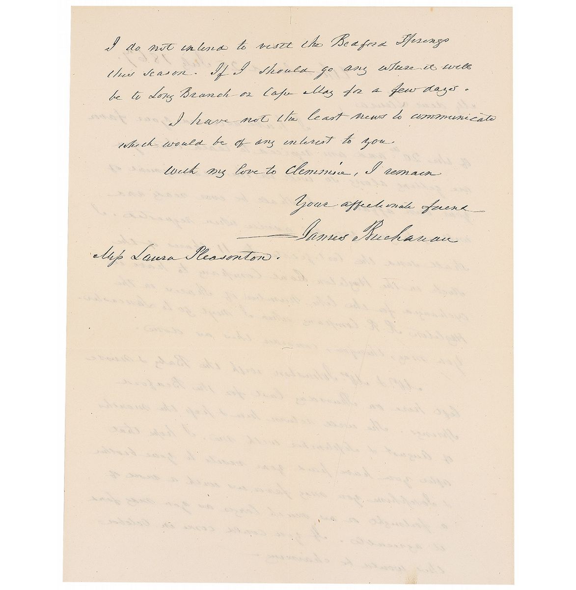 ALS, one page both sides, 6.25 x 8, July 25, 1867. Letter to Laura Pleasonton, daughter of Buchanan’s deceased friend Stephen Pleasonton. In part: “I received your favor the 20th, and rejoiced to learn that you are getting along so well in the management of your own affairs. I shall be ever ready and willing to give you my advice when requested. I shall send the Certificate for 11 Shares of the stock in the Hazelton Coal Company to have it exchanged for the like number of shares in the Hazelton R.R. Company…consider this as done. ” In fine condition, with one horizontal and one vertical fold. Accompanied by the original mailing envelope addressed in Buchanan’s hand. Best remembered for moving the government’s most valuable books and papers to safety—including the Declaration of Independence and the Constitution—before the burning of Washington in 1814, Stephen Pleasonton served as the first ‘Fifth Auditor’ of the Treasury Department until his death in 1855. An intriguing historical association.