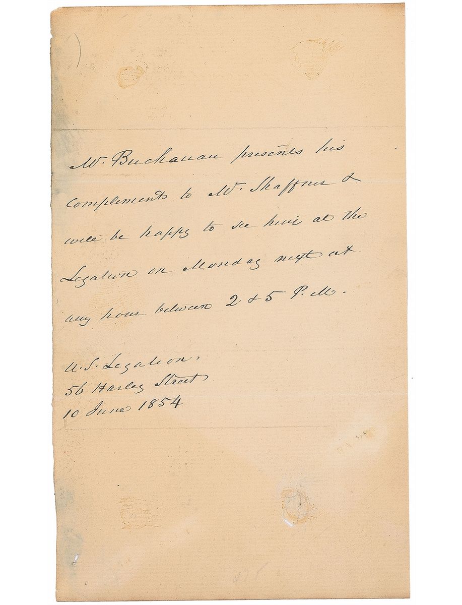 Third-person ALS, one page, 4.25 x 7, June 10, 1854. Letter written as US minister to England. In full: “Mr. Buchanan presents his compliments to Mr. Shaffner & will be happy to see him at the Legation on Monday next at any hour between 2 & 5 P. M.” Light scattered toning and staining, and a couple trivial areas of paper loss to the bottom from previous mounting, otherwise fine condition. Accompanied by a small engraved portrait. Although Buchanan had been a candidate for the Democratic nomination in the 1852 presidential election, Franklin Pierce was chosen and went on to win the election. As president, Pierce rewarded Buchanan for his selfless support during the presidential campaign by appointing him as minister to England, where he became acquainted with Queen Victoria and Prince Albert.
