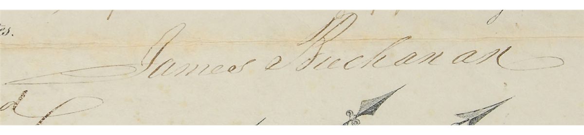 Partly-printed vellum DS as president, one page, 16 x 19.5, April 16, 1860. President Buchanan appoints Samuel Franklin Mills as “Brevet Second Lieutenant in the Second Regiment of Artillery.” Crisply signed at the conclusion by President Buchanan and countersigned by Secretary of War John B. Floyd. The blue seal affixed to the lower left remains crisp and intact. Intersecting folds (a horizontal fold passing through the top of Buchanan’s signature), scattered toning, and light foxing, otherwise fine condition. A desirable pre-Civil War US Army appointment.