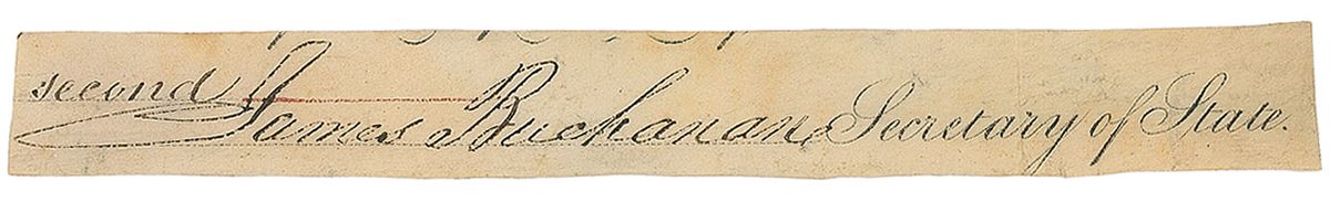Ink signature as secretary of state, “James Buchanan,” on an off-white 5.75 x .5 slip clipped from a document. Light toning, soiling, and closely cropped edges, otherwise fine condition. Buchanan served in James K. Polk’s cabinet as secretary of state from 1845 to 1849.
