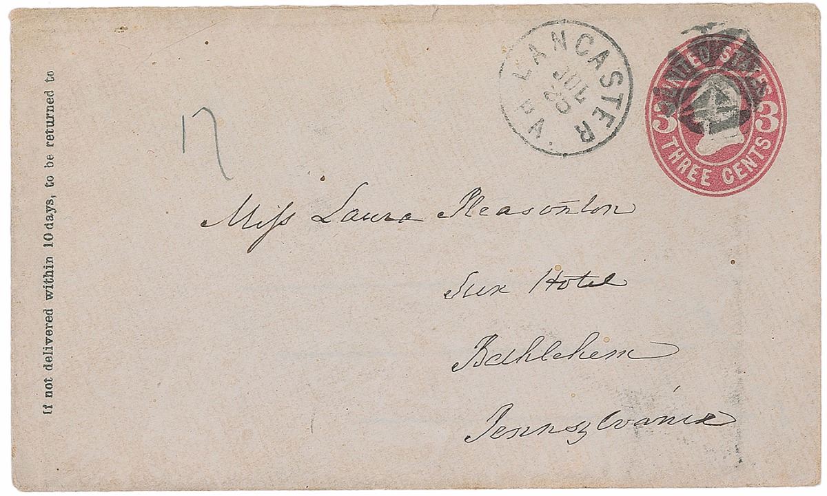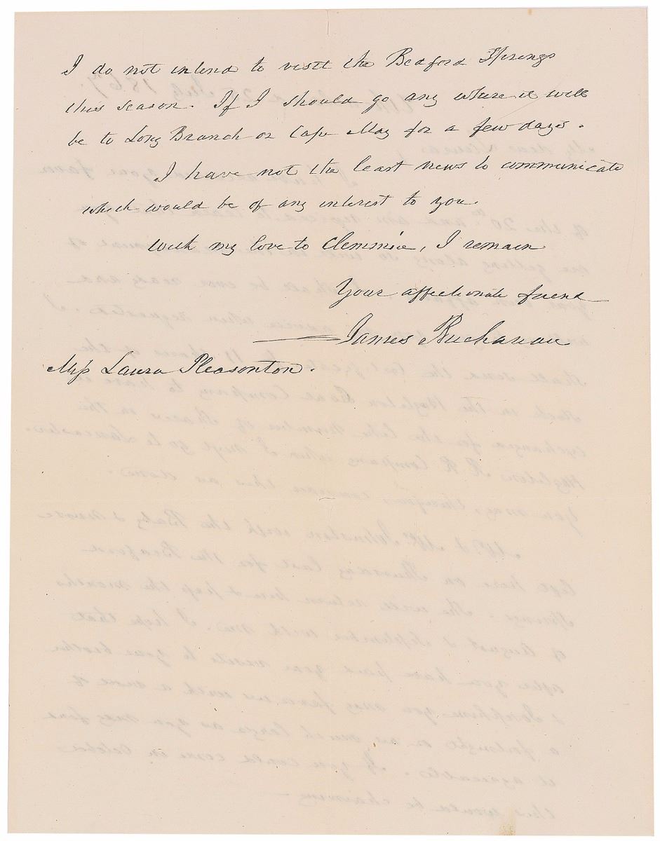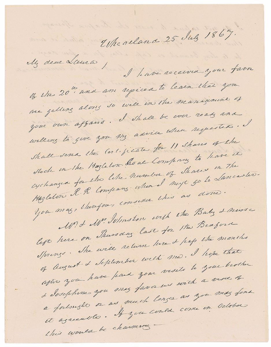 ALS, one page both sides, 6.25 x 8, July 25, 1867. Letter to Laura Pleasonton, daughter of Buchanan’s deceased friend Stephen Pleasonton, in full: “I have received your favor of the 20th, and am rejoiced to learn that you are getting along so well in the management of your own affairs. I shall be ever ready and willing to give you my advice when requested. I shall send the Certificate for 11 Shares of the stock in the Hazelton Coal Company to have it exchanged for the like number of shares in the Hazelton R.R. Company when I next go to Lancaster. You may, therefore, consider this as done. Mr. & Mrs. Johnston with the Baby & nurse left here on Thursday last for the Beaford Springs. She will return here & pass the months of August & September with me. I hope that after you have paid your visits to your brother & Josephine you may favor us with a visit of a fortnight or as much longer as you may find it agreeable. If you could come in October, this would be charming. I do not intend to visit the Beaford Springs this season. If I should go any where it will be to Long Branch [NJ] or Cape May [NJ] for a few days. I have not the least news to communicate which would be of any interest to you.” In fine condition, with one horizontal and one vertical fold (with a partial separation to top edge). Accompanied by the original mailing envelope addressed in Buchanan’s hand.