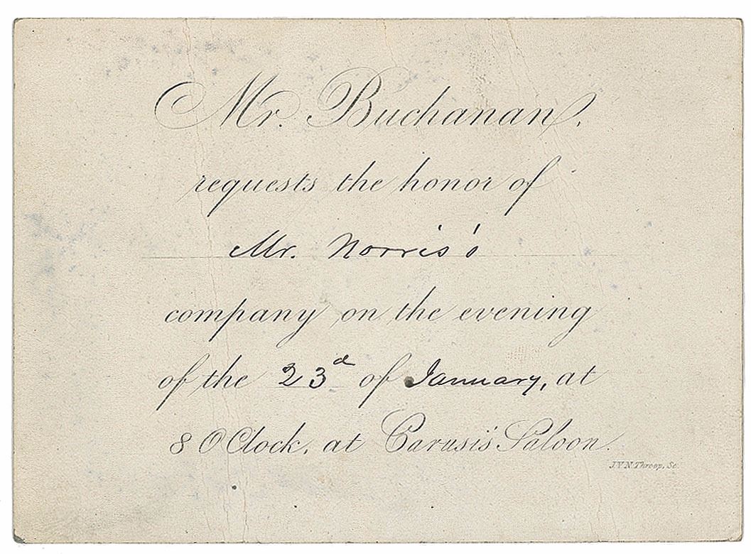 Partly-printed invitation filled out in another hand, unsigned, one page, 4.5 x 3.25, no date. In full: “Mr. Buchanan requests the honor of Mr. Norris’s company on the evening of the 23d of January, at 8 O’Clock at Carusi’s Saloon.” In very good condition, with two large vertical creases and scattered soiling.