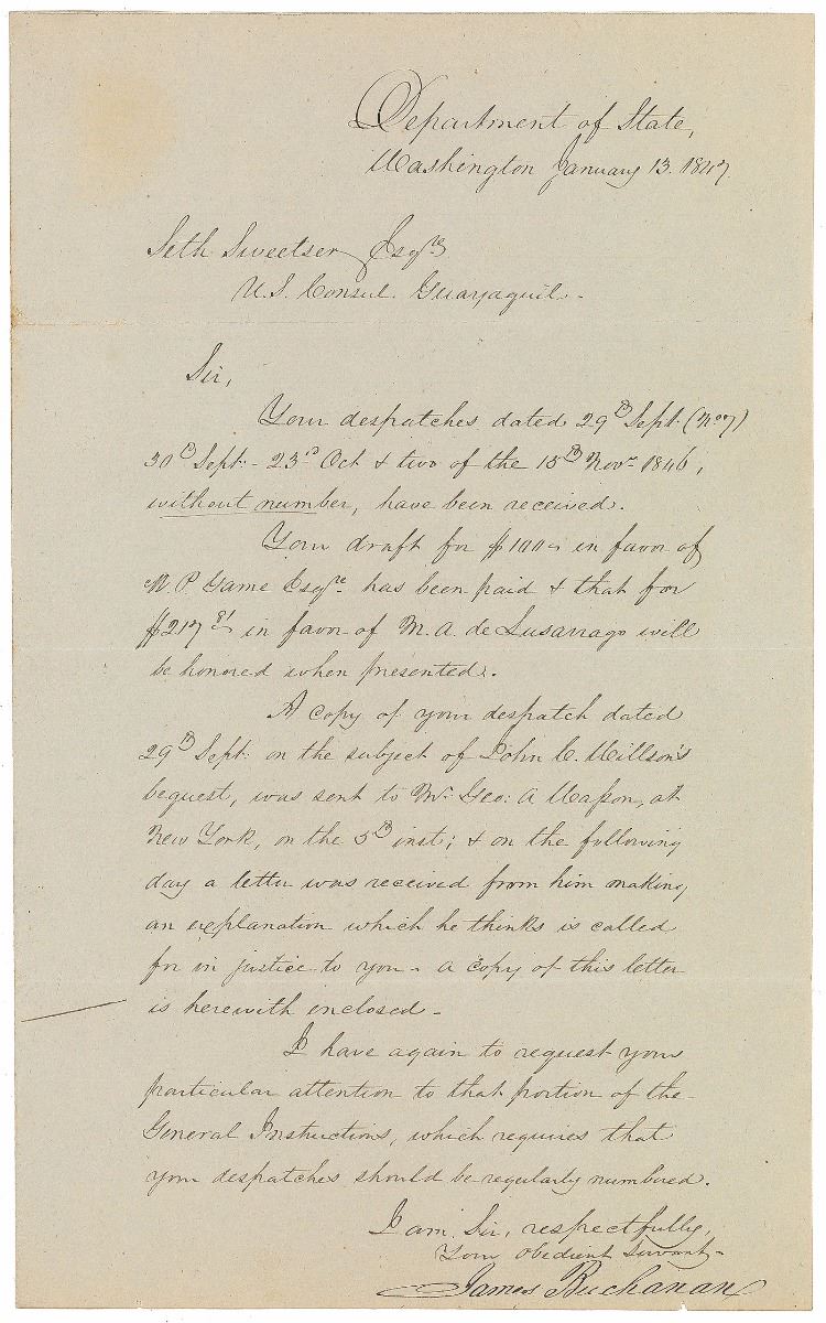 LS as secretary of state, one page, 8 x 13.25, January 13, 1847. Letter to Seth Sweetser, in part: “Your despatches dated 29th Sept…30th Sept—23rd Oct & two of the 15th Nov. 1846, without number, have been received. Your draft for $100…has been paid & that for $217.81 in favor of M. A. de Susanago will be honored when presented. A copy of your despatch dated 29th Sept. on the subject of John C. Neillson’s bequest, was sent to Mr. Geo.: A. Neason, at New York, on the 5th inst; & on the following day a letter was received from him making an explanation which he thinks is called for in justice to you.” Crisply signed at the conclusion by Buchanan. In fine condition.