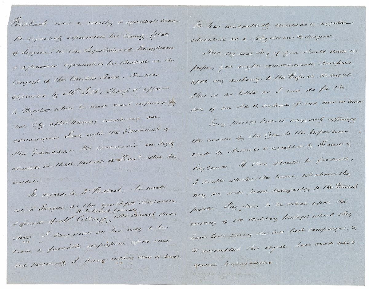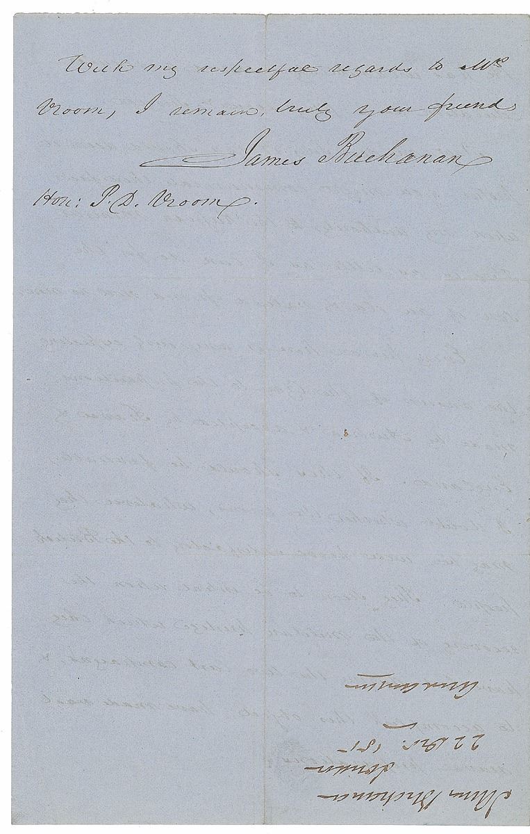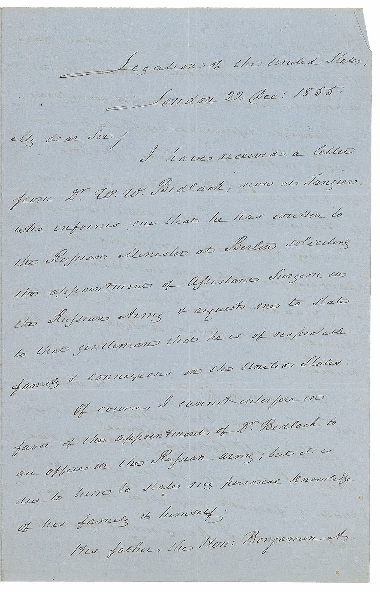 ALS, four pages on two adjoining sheets, 5.25 x 8.25, December 22, 1855. Letter to Hon. Peter D. Vroom, written while serving as minister to the United Kingdom. In part: “I have received a letter from Dr. W. W. Bidlack, now at Tangier, who informs me that he has written to the Russian Minister at Berlin soliciting the appointment of Assistant Surgeon in the Russian Army…I cannot interfere in favor of the appointment of Dr. Bidlack to an office in the Russian Army; but it is due to him to state my personal knowledge of his family and himself.