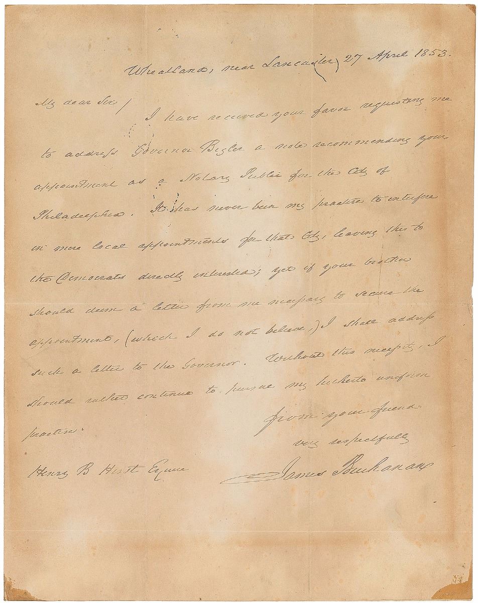 ALS, one page, 7.75 x 9.75, April 27, 1853. Letter to Henry B. Hirst, in full: “I have received your favor requesting me to address Governor Bigler a note recommending your appointment as a Notary Public for the City of Philadelphia. It has never been my practice to interfere in more local appointments for that City, leaving this to the Democrats directly interested; yet if your brother should deem a letter from me necessary to secure the appointment, (which I do not believe,) I shall address such a letter to the Governor. Without this necessity, I should rather continue to pursue my hitherto uniform practice.” In very good condition, with scattered overall toning, adhesive remnants to lower corner tips, and a heavier line of adhesive remnants to reverse of second integral page (not affecting the letter).