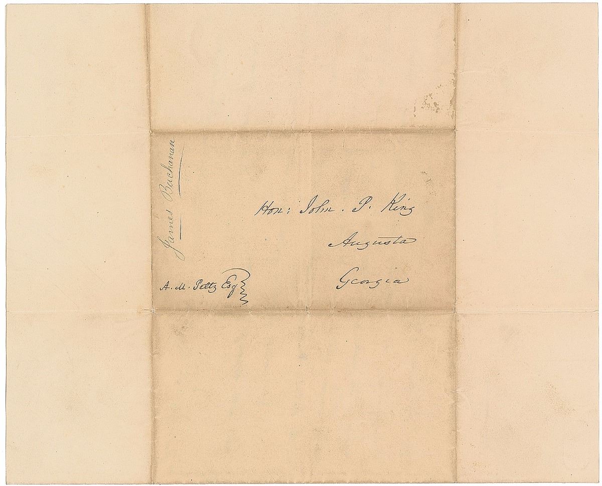 ALS, one page, 8 x 9.75, March 2, 1838. Letter to Senator John Pendleton King of Georgia. In part: “I take great pleasure in introducing to you my friend Alexander M. Petty Esquire of the Senate of Pennsylvania. He is in every respect worthy of your highest regard. The people of the State will very much regret the necessity which compels, such a man, at such a time, to abandon his seat in the Senate, to seek for health in the genial clime of the South. You cannot confer a greater favor upon me than by meeting him with kindness & attention.” Addressed on the reverse of the second integral leaf in Buchanan’s hand. In fine condition, with several intersecting mailing folds.