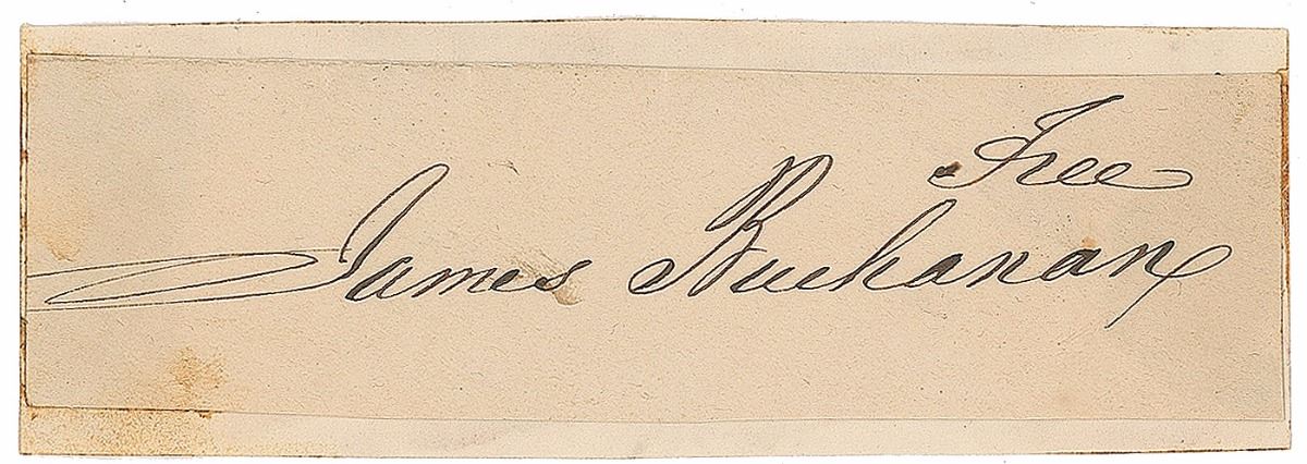 Ink signature, “Free, James Buchanan,” on an off-white 4 x 1 slip clipped from a free frank. Affixed to a slightly larger slip. In fine condition, with a bit of adhesive residue to left edge. Accompanied by an unsigned engraving of Buchanan.