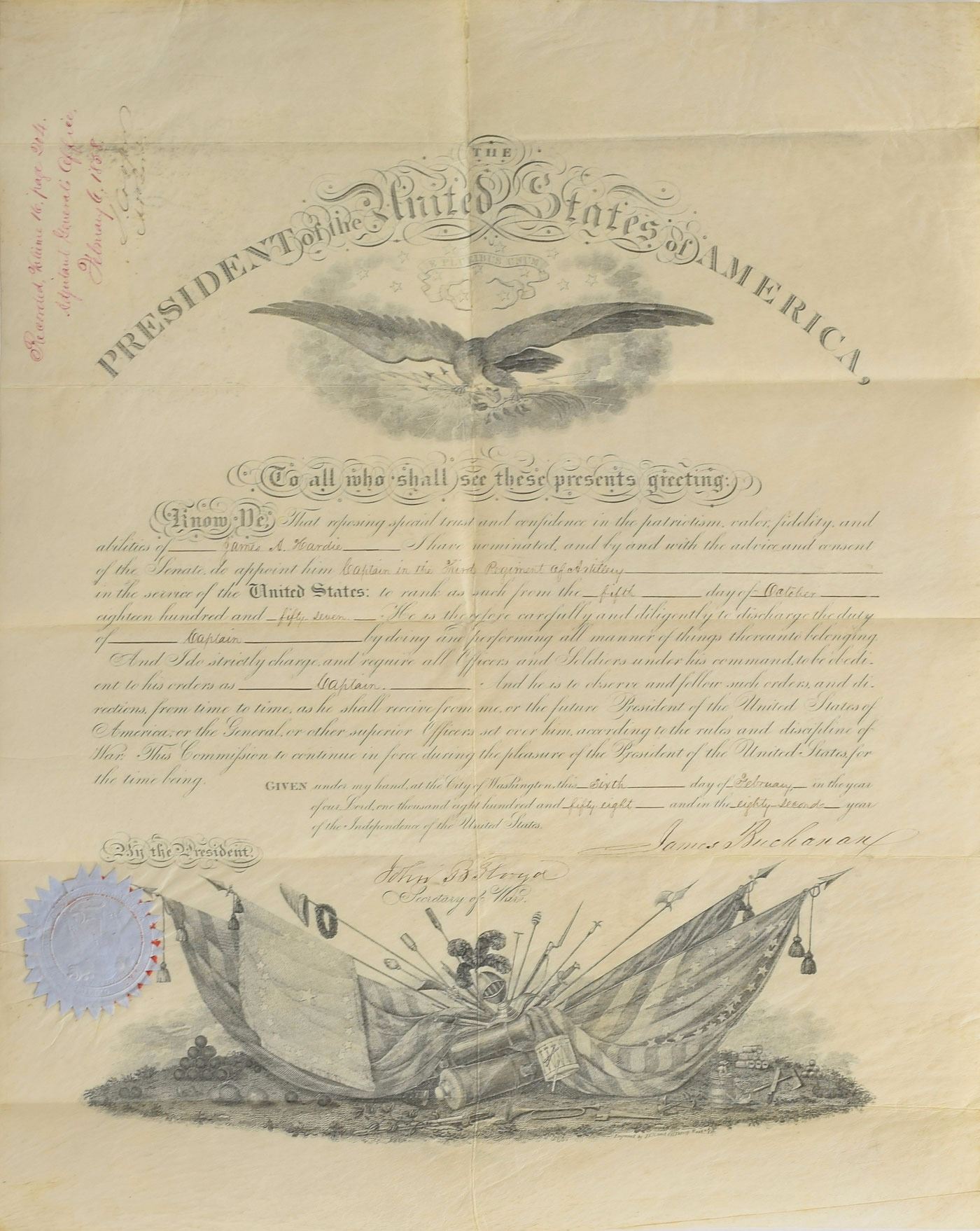 Partly-printed vellum DS as president, one page, 15.75 x 19.25, February 6, 1858. President Buchanan appoints James A. Hardie as "Captain in the Third Regiment of Artillery in the service of the United States." Signed at the conclusion by Buchanan, and countersigned by Secretary of War John B. Floyd. War Office seal remains affixed to lower left. In very good to fine condition, with small areas of vellum loss along intersecting folds reinforced with archival tape on the reverse.