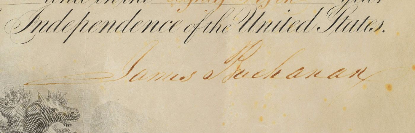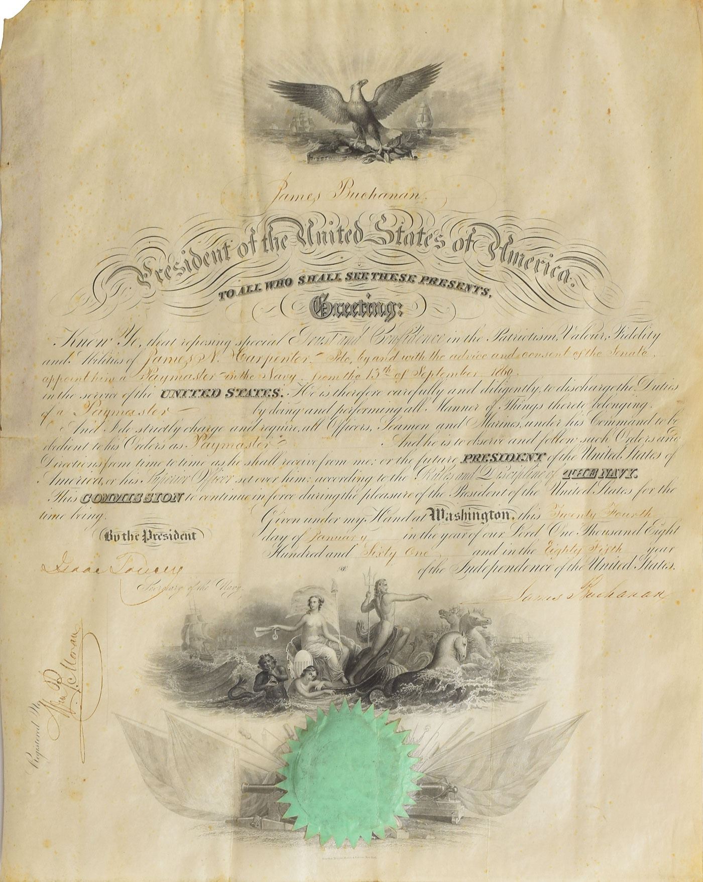 Partly-printed vellum DS as president, one page, 14.5 x 18, January 24, 1861. President Buchanan appoints James N. Carpenter as "a Paymaster in the Navy." Signed at the conclusion by Buchanan, and countersigned by Secretary of the Navy Isaac Toucey. Green Navy Department seal remains affixed to lower vignette. In very good condition, with moderately heavy overall rippling and old mounting remnants on the reverse.