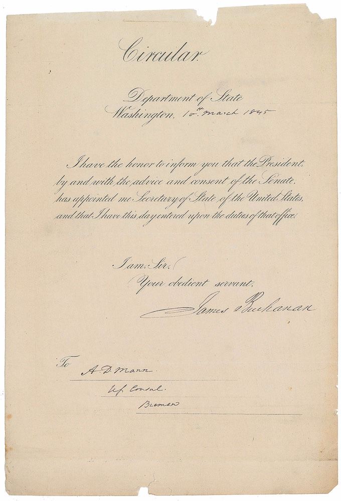 LS, one page, 8 x 11.75, March 10, 1845. Department of State circular letter, addressed to "A. D. Mann, U. S. Consul, Bremen," in full: "I have the honor to inform you that the President, by and with the advice and consent of the Senate, has appointed me Secretary of State of the United States, and that I have this day entered upon the duties of that office." In fine condition, with paper loss to the top and bottom edges, easily matted out. After taking office on March 10th, Buchanan served out his full term as secretary of state under James K. Polk, marked by some major accomplishments; namely, nearly doubling the territorial extent of the United States through the Oregon Treaty and the Treaty of Guadalupe Hidalgo.