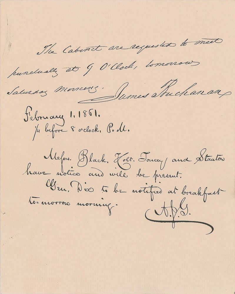 ANS as president, one page, 6.25 x 7.75, February 1, 1861. In full: "The Cabinet are requested to meet punctually at 9 O'clock, tomorrow Saturday morning. James Buchanan." The lower portion features a note from Buchanan's private secretary, Adam John Glossbrenner, in full: "Messers. Black, Holt, Toucey, and Stanton have notice and will be present. Gen. Dix to be notified at breakfast to-morrow morning. A.J.G." In fine condition. A neatly penned White House missive dating to late in President Buchanan’s lone term in office.