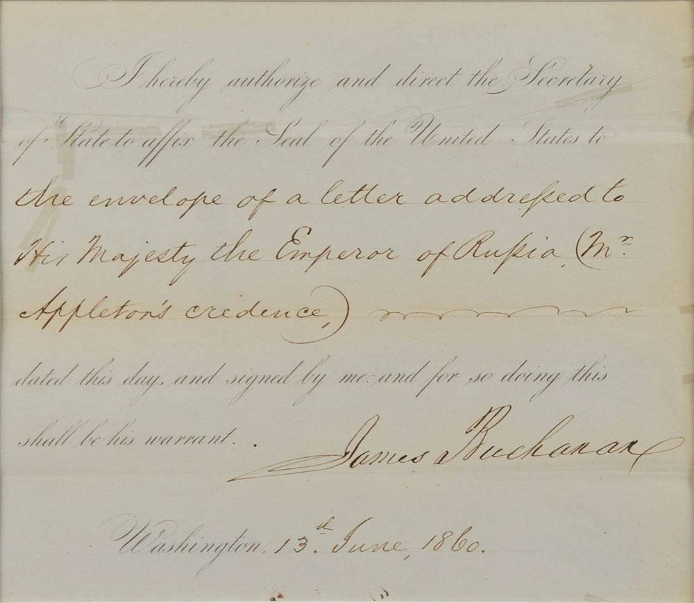 Partly-printed DS as president, one page, 6.75 x 5.75, June 13, 1860. President Buchanan authorizes and directs the "Secretary of State to affix the Seal of the United States to the envelope of a letter addressed to His Majesty the Emperor of Russia (Mr. Appleton's credence)." Matted and framed with a portrait and medal to an overall size of 18 x 16. In very good condition, with scattered light creasing and evidence of small tape repairs on the reverse.