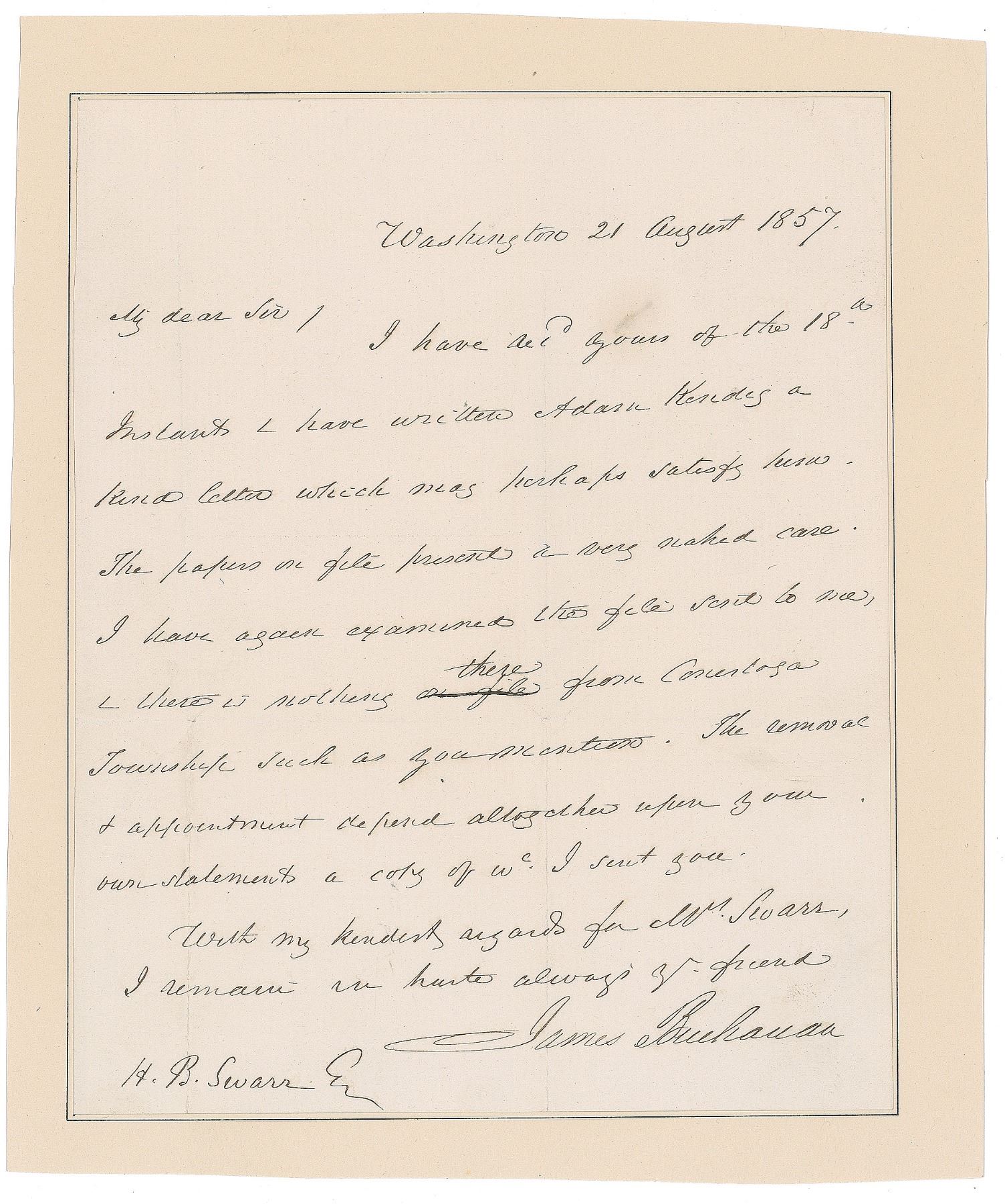 Neatly penned ALS as president, one page, 6.5 x 8, August 21, 1857. Letter to H. B. Swarr, in part: "I have written Adam Kendes a kind letter which may perhaps satisfy him. The papers on file present a very naked case. I have again examined the file sent to me, & there is nothing there from Conestoga Township such as you mention. The removal & appointment depend altogether upon your own statements." Affixed at the left edge to a cardstock sheet. In fine condition.