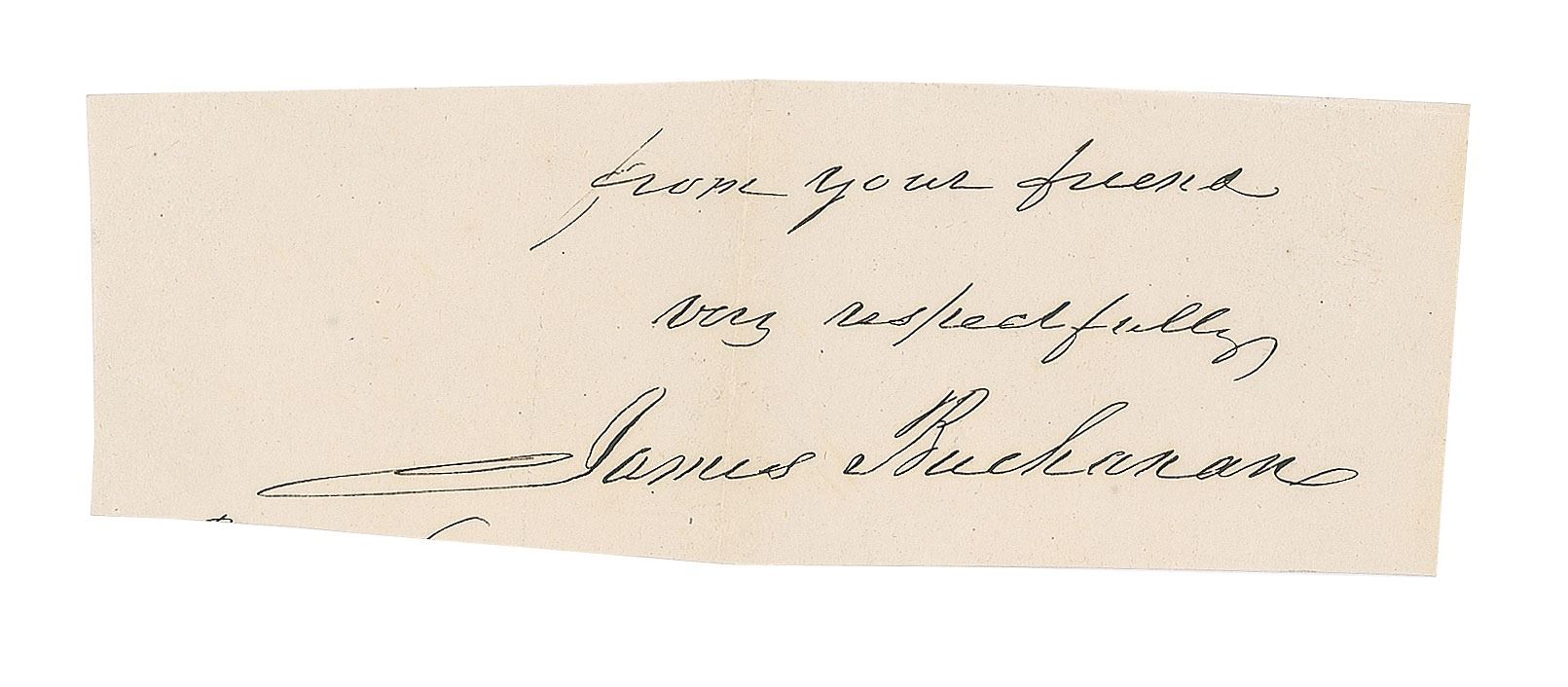 Ink signature, "from your friend, very respectfully, James Buchanan,” on an off-white 4.75 x 1.5 slip. In very good to fine condition, with two vertical creases.