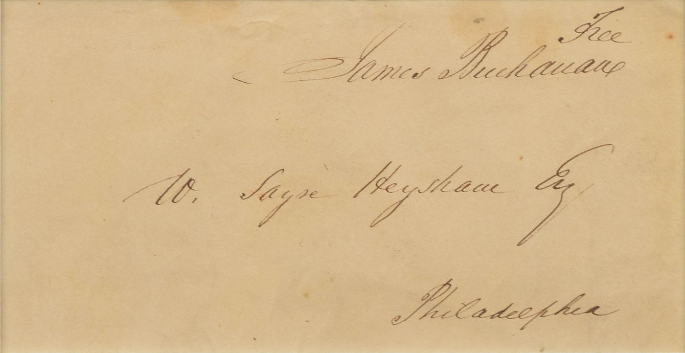Free frank panel, 5.75 x 2.75, addressed by another hand to “W. Sayre Heysham Esq., Philadelphia,” and franked in the upper right, “Free, James Buchanan." Matted and framed with an engraving of Buchanan to an overall size of 12.5 x 18.25. In fine condition, with some light creasing and soiling.