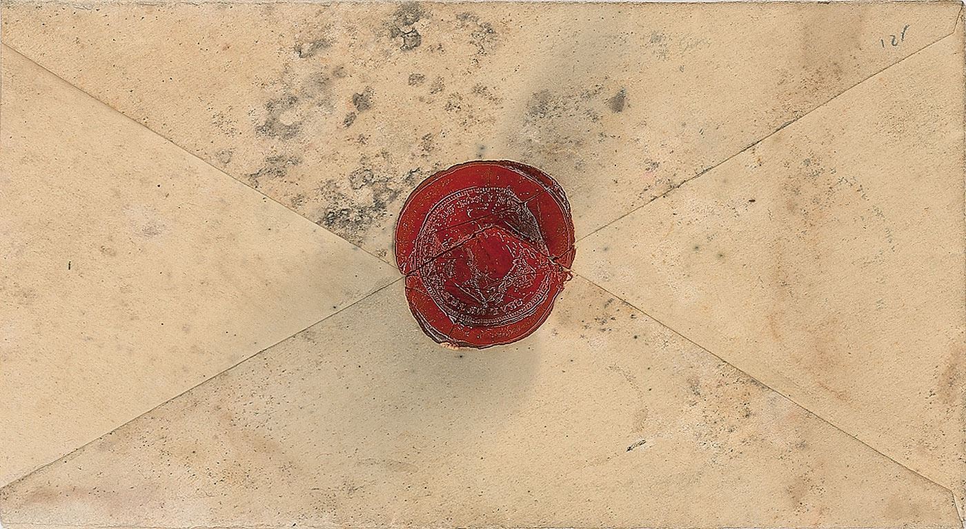 Free-franked mailing envelope as president, 5 x 2.75, addressed in Buchanan's hand to "William Nicholson Esquire, Erie, Pennsylvania," and franked in the upper right, "Free, James Buchanan." The front panel bears a "Free" postmark from Washington, D.C., dated 1860. The red wax seal on the reverse has diminutive, but mostly legible, text around the circumference, "Seal of the President of the United [States]." In very good condition, with overall soiling and staining, heavier on the reverse; interestingly, the red wax seal is largely intact (though clearly opened).