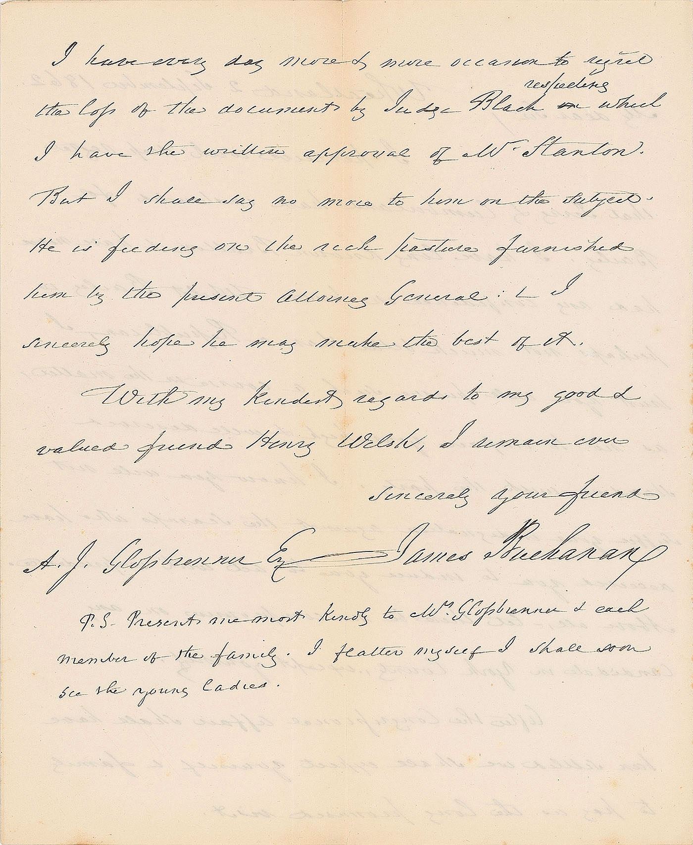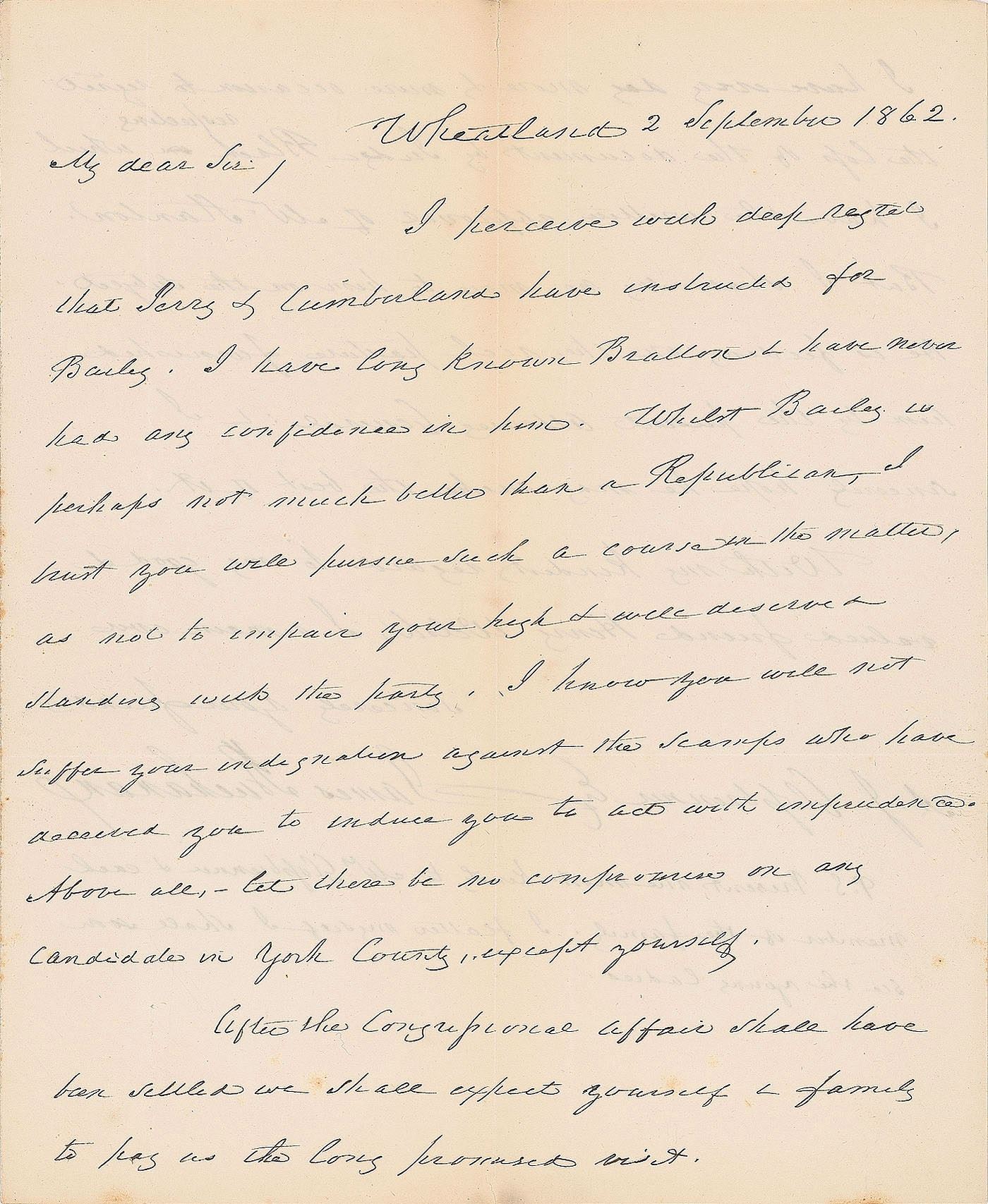 ALS, one page both sides, 6.75 x 8, September 2, 1862. Letter to his former secretary, Adam J. Glossbrenner, in part: "Whilst Bailey is perhaps not much better than a Republican, I trust you will pursue such a course in the matter, as not to impair your high & well deserved standing with the party. I know you will not suffer your indignation against the scamps who have deceived you to induce you to act with imprudence. Above all, let there be no compromise on any candidate in York County, except yourself…I have every day more & more occasion to regret the loss of the document by Judge Black respecting which I have the written approval of Mr. Stanton. But I shall say no more to him on the subject. He is feeding on the rich pasture furnished him by the present Attorney General." In very good to fine condition, with scattered light creasing, and a small split along one of the several vertical folds.