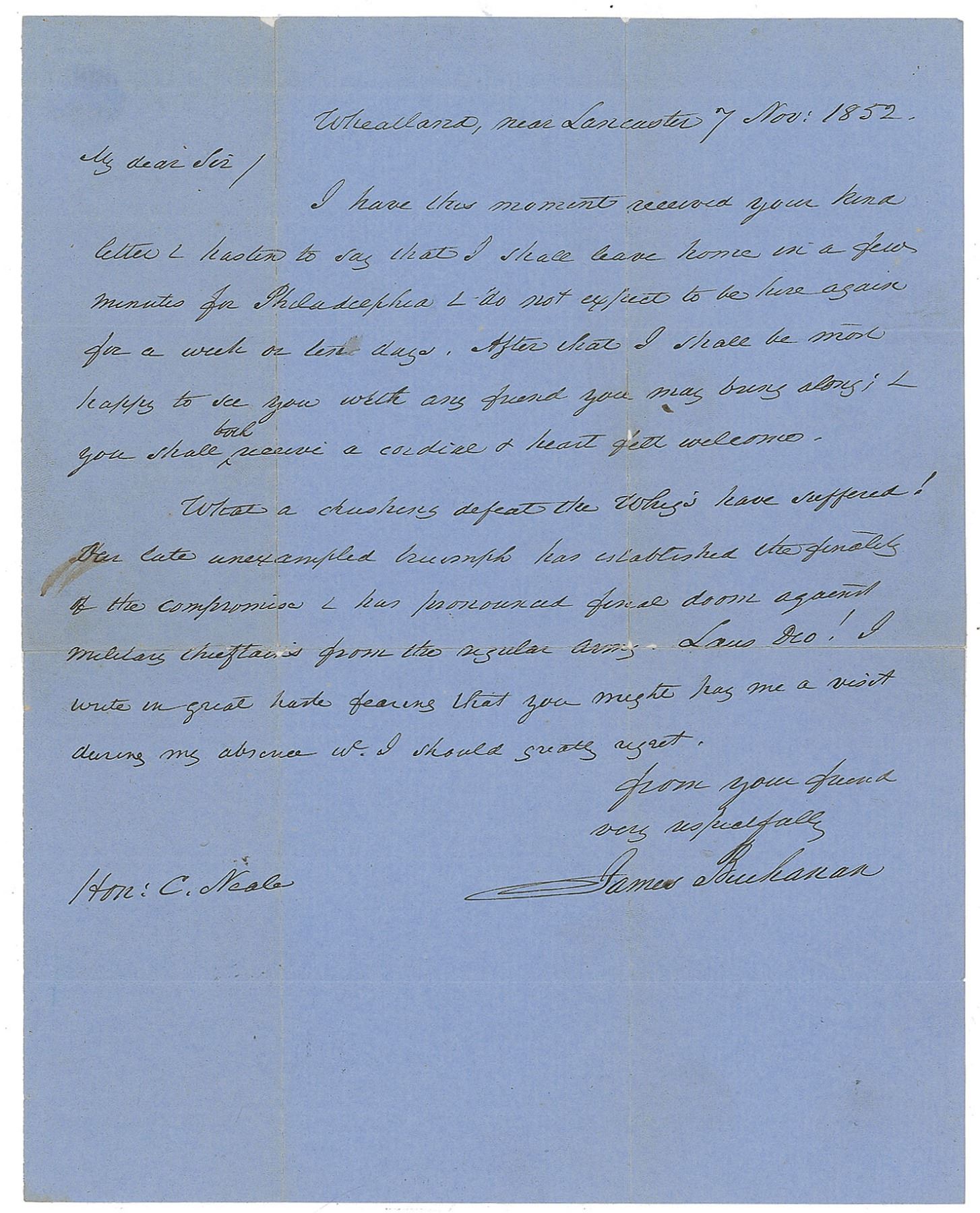 ALS, one page, 7.75 x 10, November 7, 1852. Letter to the Hon. Chapman Neale, in full: "I have this moment received your kind letter & hasten to say that I shall leave home in a few minutes for Philadelphia & do not expect to be here again for a week or ten days. After that I shall be most happy to see you with any friend you may bring along; & you shall both receive a cordial & heartfelt welcome. What a crushing defeat the Whigs have suffered! Our late unexampled triumph has established the finality of the compromise & has pronounced final doom against military chieftains from the regular army. Laus Deo! I write in great haste fearing that you might pay me a visit during my absence which I should greatly regret." In very good to fine condition, with light toning and splitting along the intersecting folds, reinforced on the reverse with archival tape.