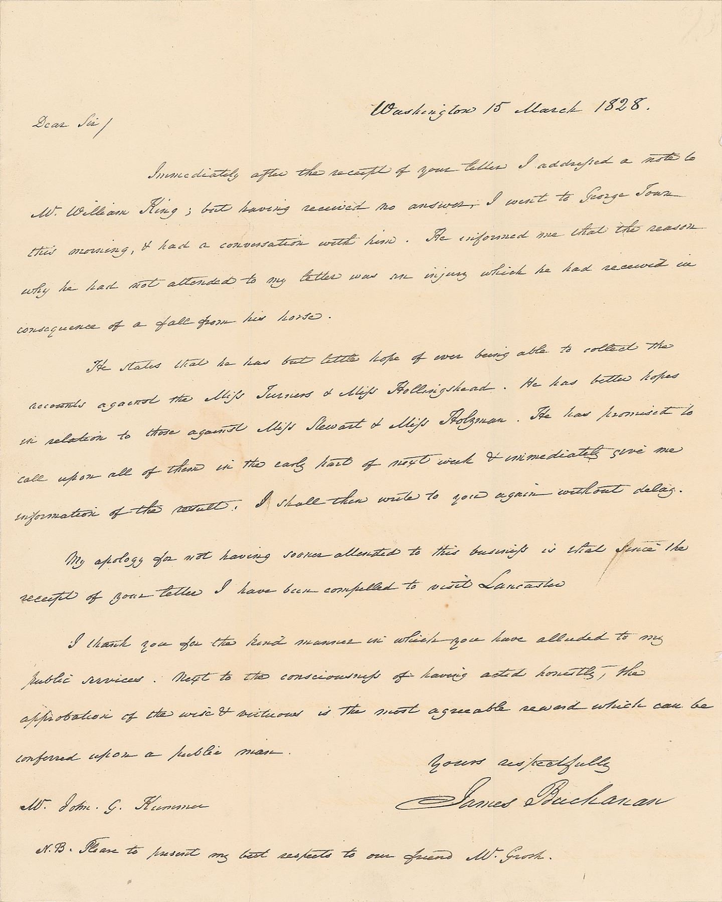 ALS as a Pennsylvania congressman, one page, 8 x 10, March 15, 1828. Written from Washington, D.C., a letter to John G. Kammer, concerning collection of debts to be assisted by William King, possibly the senator and future vice president, in full: "Immediately after the receipt of your letter I addressed a note to W. William King; but having received no answer, I went to George Town this morning, & had a conversation with him. He informed me that the reason why he had not attended to my letter was an injury which he had received in consequence of a fall from his horse. He states that he has but little hope of ever being able to collect the accounts against the Miss Turners & Miss Hollingshead. He has better hopes in relation to those against Miss Stewart & Miss Holzman. He has promised to call upon all of them in the early part of next week & immediately give me information of the result. I shall then write to you again without delay. My apology for not having sooner attended to this business is that since the receipt of your letter I have been compelled to visit Lancaster. I thank you for the kind manner in which you have alluded to my public services. Next to the consciousness of having acted honestly, the approbation of the wise & virtuous is the most agreeable reward which can be conferred upon a public man." In a postscript, Buchanan has added: "Please to present my best respects to our friend W. Grosh." In fine condition, with multiple intersecting folds.