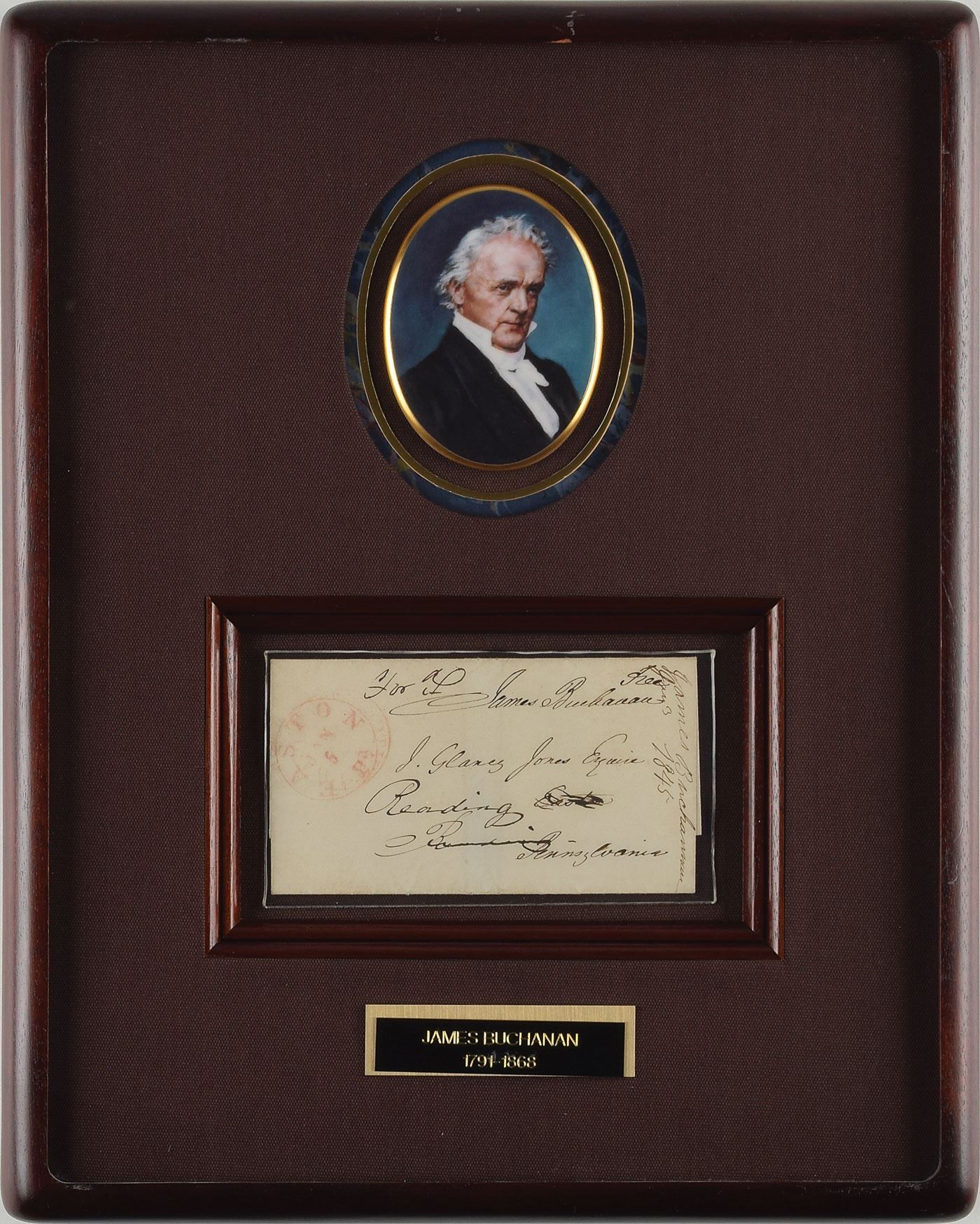Hand-addressed and free-franked address panel as senator, 5 x 2.75, partially addressed in Buchanan's hand to "J. Glancy Jones Esquire…Pennsylvania," and crisply franked in the upper right corner, "Free, James Buchanan." Postmarked at Easton, Pennsylvania, January 5, [no year but annotated 1845]. Archivally encapsulated in Mylar, mounted, matted, and framed with a gilt-edged porcelain ‘Oval Office Collection’ portrait by Christian Bell Porcelain and nameplate to an overall size of 11.75 x 14.75. In fine condition, with scratching to the top of the frame. Jehu Glancy Jones was a Democratic member of the House of Representatives from Pennsylvania; when Buchanan became president, he appointed Jones as US minister to the Austrian Empire.