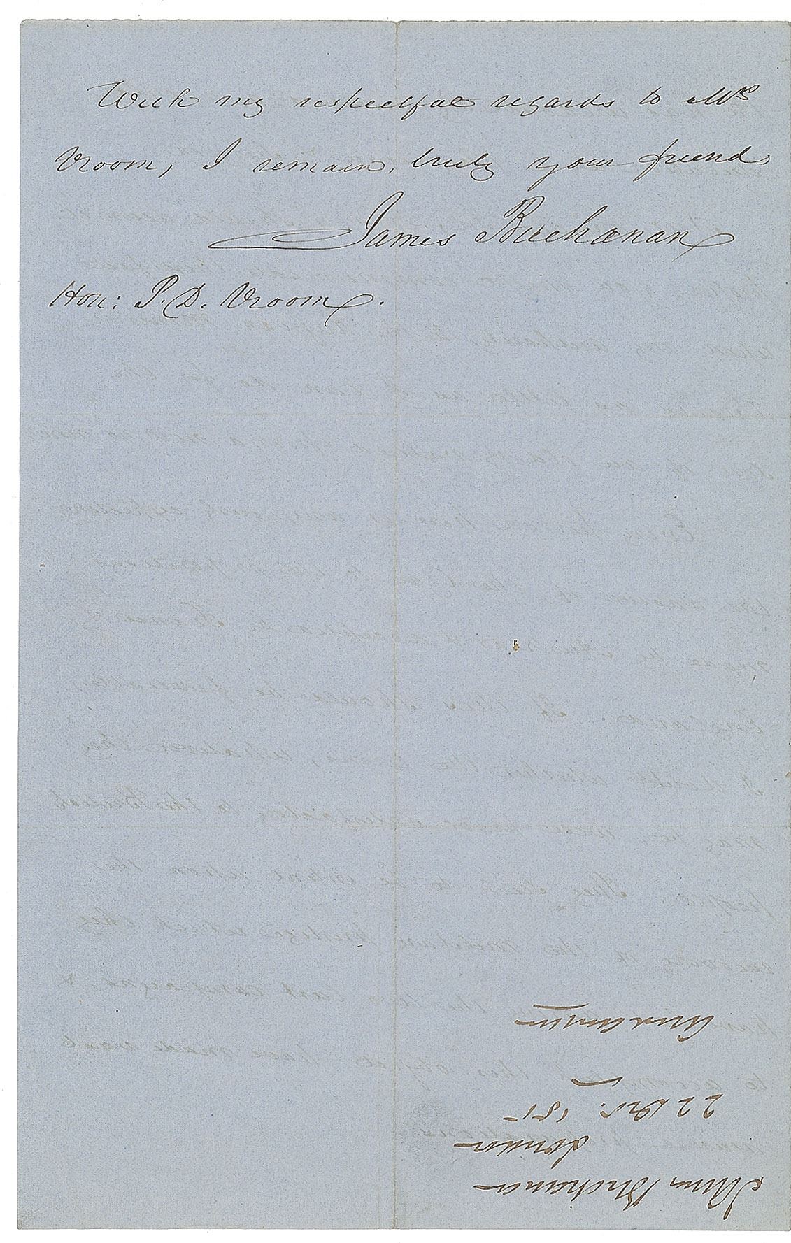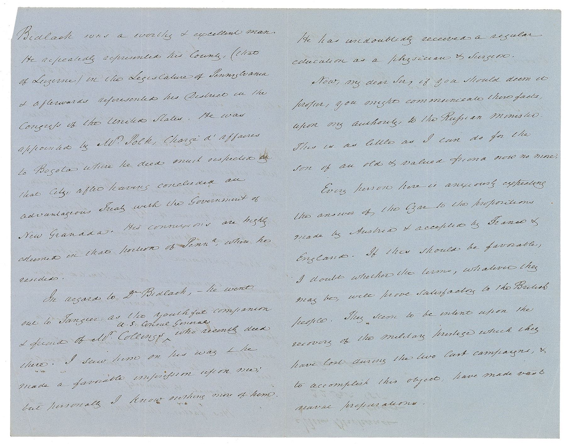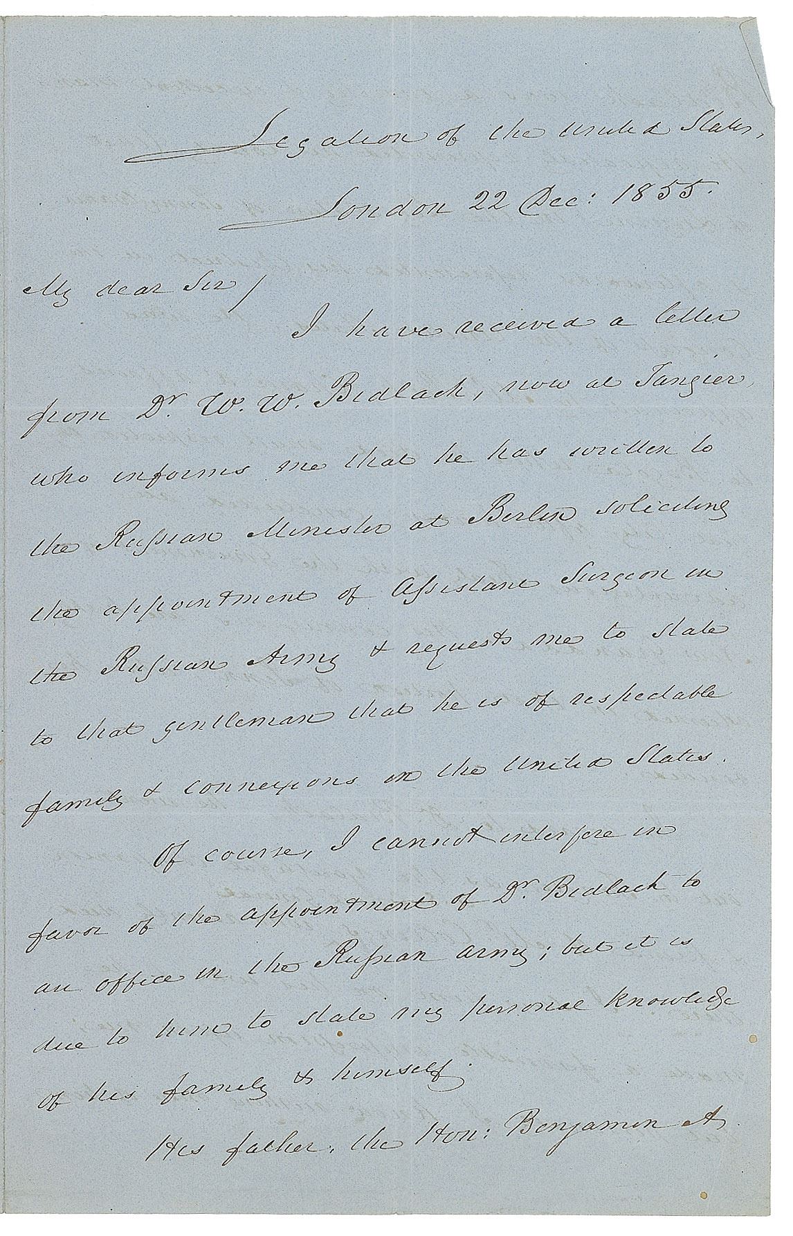 ALS, four pages on two adjoining sheets, 5.25 x 8.25, December 22, 1855. Letter to Hon. Peter D. Vroom, written while serving as minister to the United Kingdom. In part: "I have received a letter from Dr. W. W. Bidlack, now at Tangier, who informs me that he has written to the Russian Minister at Berlin soliciting the appointment of Assistant Surgeon in the Russian Army…I cannot interfere in favor of the appointment of Dr. Bidlack to an office in the Russian Army; but it is due to him to state my personal knowledge of his family and himself.
