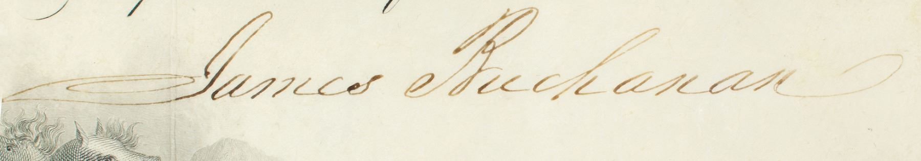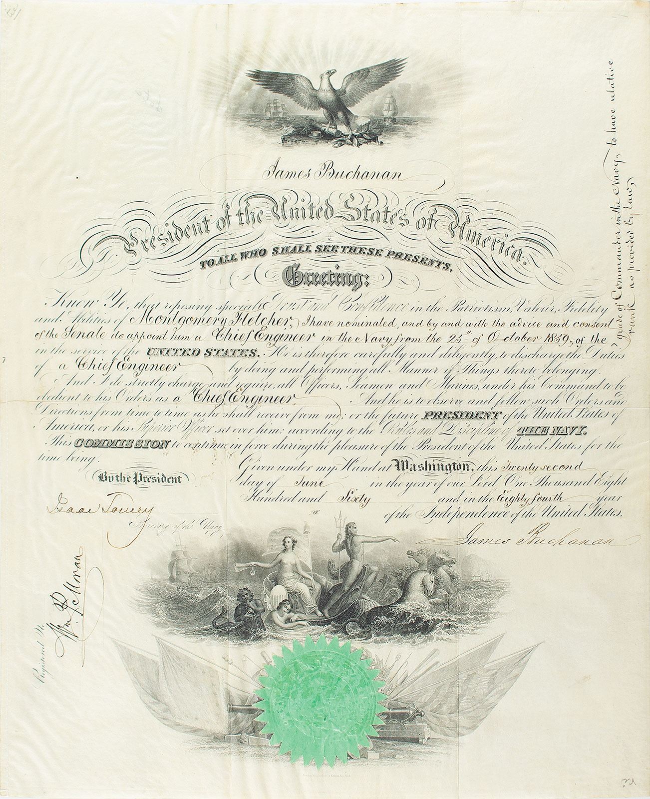 Partly-printed vellum DS as president, one page, 14.5 x 17.75, June 22, 1860. President Buchanan appoints Montgomery Fletcher as "a Chief Engineer in the Navy…in the service of the United States." Signed crisply at the conclusion by James Buchanan, and countersigned by Secretary of the Navy Isaac Toucey. Embossed green Navy Department seal remains affixed to lower vignette. In fine condition. Montgomery Fletcher served on the USS Saranac in the Pacific Squadron throughout the entirety of the Civil War.