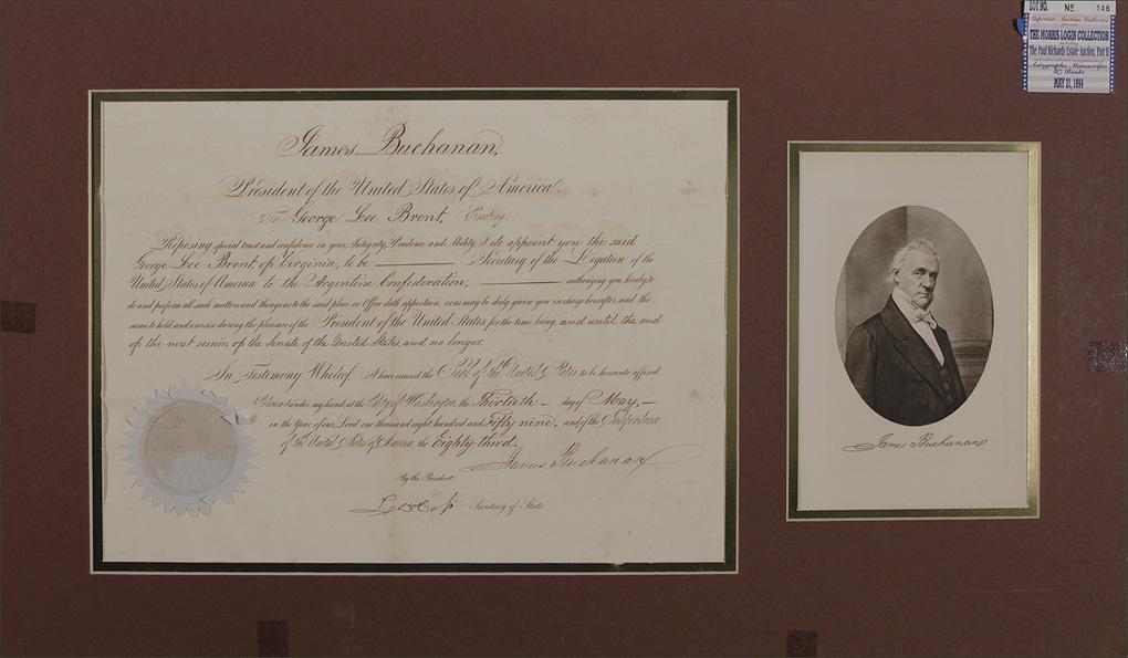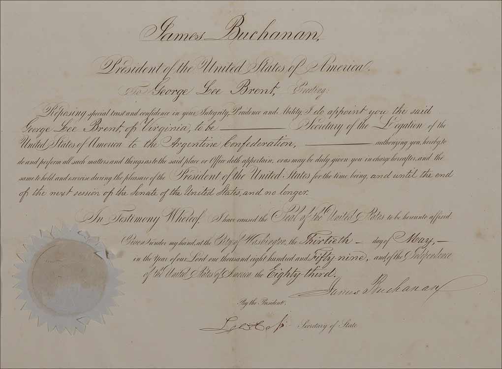 Partly-printed DS as president, one page, 15 x 11, May 30, 1859. President Buchanan appoints George Lee Brent “to be Secretary of the Legation of the United States of America to the Argentine Confederation.” Nicely signed at the conclusion by Buchanan and countersigned by Secretary of State Lewis Cass. Double matted with an engraved portrait of Buchanan, to an overall size of 27 x 16. In very good condition, with intersecting folds, scattered light toning and foxing, and tape remnants and label to mat. The white seal is toned, but intact. Oversized.