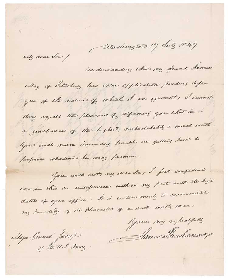 LS as president, one page, 8.25 x 10.25, July 17, 1847. Letter of recommendation to General Jesup of the United States Army. In full: “Understanding that my friend James May of Pittsburg has some application pending before you of the nature of which I am ignorant, I cannot deny myself the pleasure of informing you that he is a gentleman of the highest respectability & moral worth. You will never have any trouble in getting him to perform whatever he may promise. You will not, my dear Sir, I feel confident consider this an interference on my part with the high duties of your office. It is written merely to communicate my knowledge of the character of a most worthy man.” In fine condition, with intersecting folds, one through a single letter of signature, a few creases, light show-through from docketing on reverse, and a couple small tape repairs on reverse of slight separations. Pre-certified John Reznikoff/PSA/DNA and RRAuction COA.