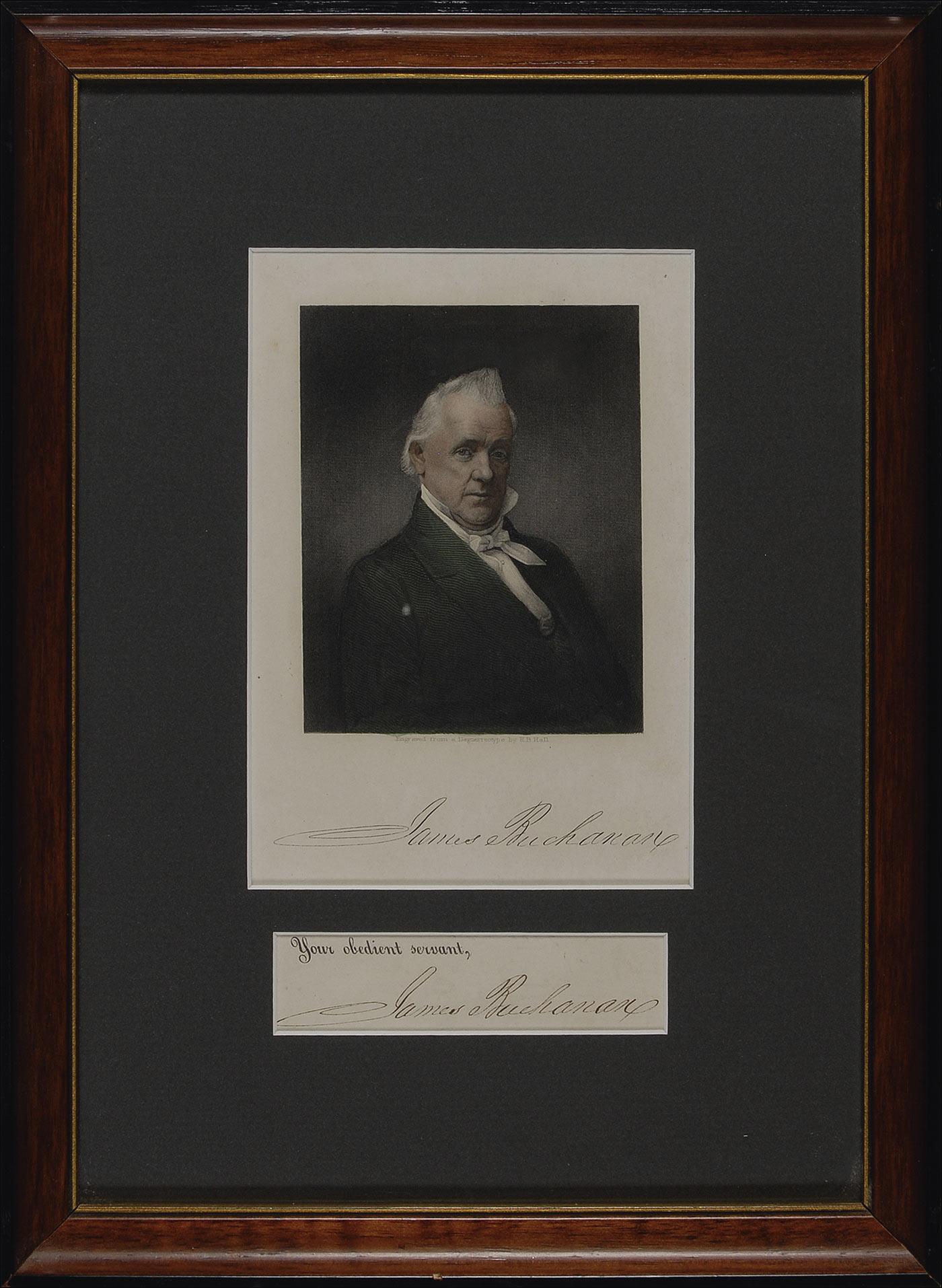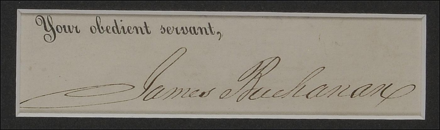Ink signature, “Free, James Buchanan,” on an off-white 3.5 x 1 slip clipped from a free frank, affixed to a same-sized card. In very good condition, with moderate toning and soiling affecting appearance. Pre-certified John Reznikoff/PSA/DNA and RRAuction COA.