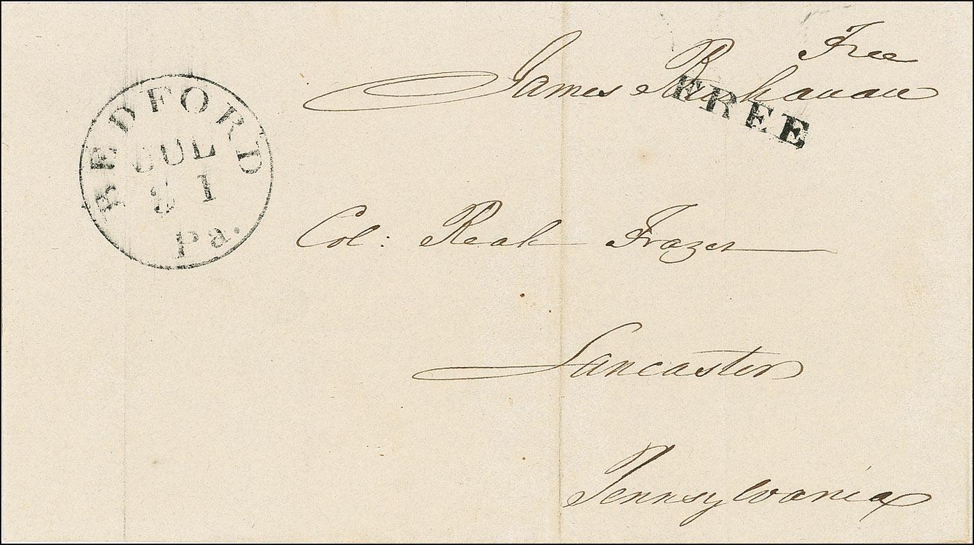 Complete hand-addressed free frank, 6 x 3.5, which unfolds to 10 x 8, addressed in Buchanan’s hand to “Col: Reah Frazer, Lancaster, Pennsylvania,” and franked in the upper right, “Free James Buchanan.” In fine condition, with “Free” stamp over portion of signature, vertical crease through a single letter of signature, and some paper loss to edge from wax seal. Pre-certified John Reznikoff/PSA/DNA and RRAuction COA.